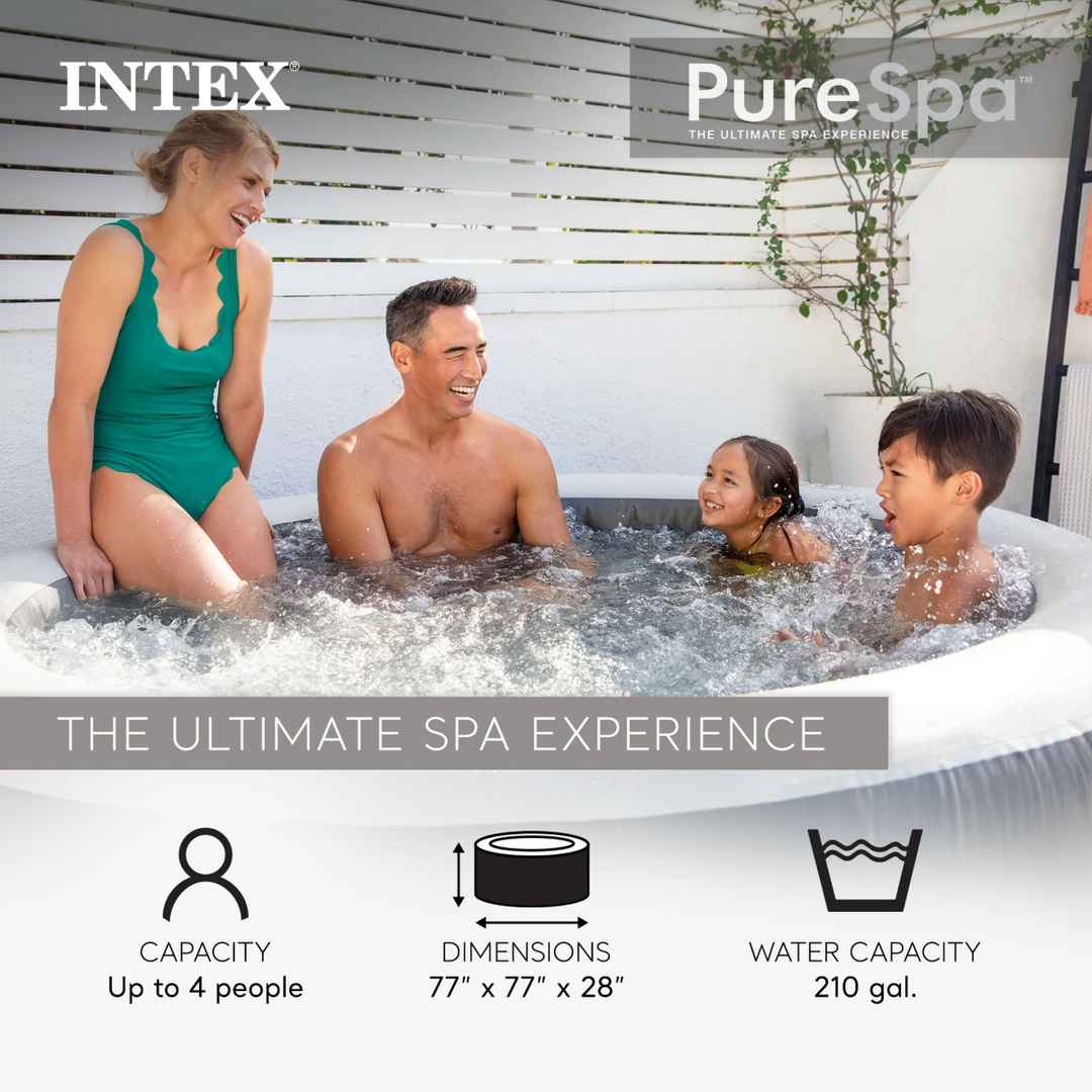 Let your worries bubble away as you unwind in the PureSpa Plus Portable Inflatable Hot Tub from Intex.The PureSpa provides relaxation at the touch of a button and accommodates up to 4 people. Activate the 140 high-powered bubble jets that surround the interior of the spa for a refreshing massage. Sc...more