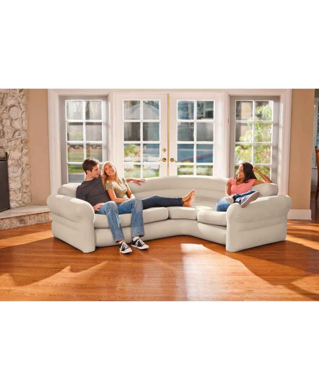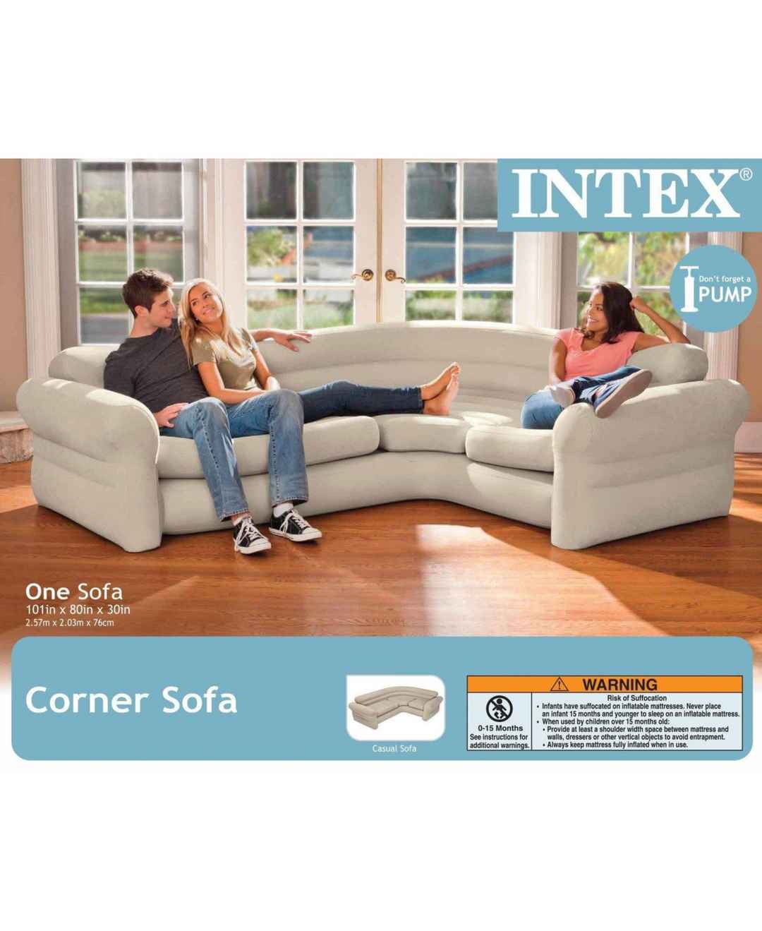 68575EPThis Intex Inflatable Corner Sofa works as a great addition to any living room, rec room, or even to take camping. With a waterproof flocked top surface, a vinyl bottom, and a neutral color, this sectional sofa fits any decor and environment. It has deep seats and wide armrests for a practica...more