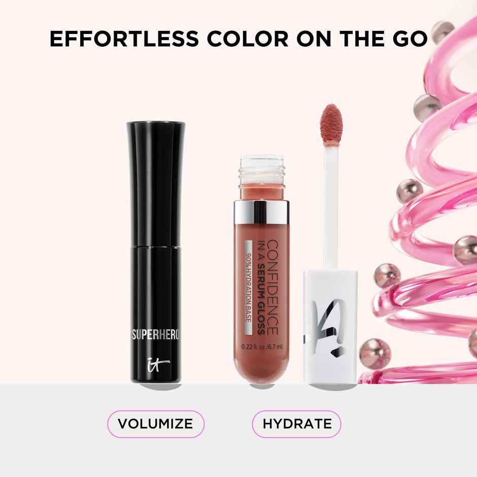 Unwrap the gift of effortless color on the go with your full-size Confidence in a Serum Lip Gloss in a universal neutral pink shade and travel-size Superhero Volumizing & Lengthening Mascara. Drench lips in sheer hydrating color and take lashes to new heights with your essential eye and lip kit. Unw...more