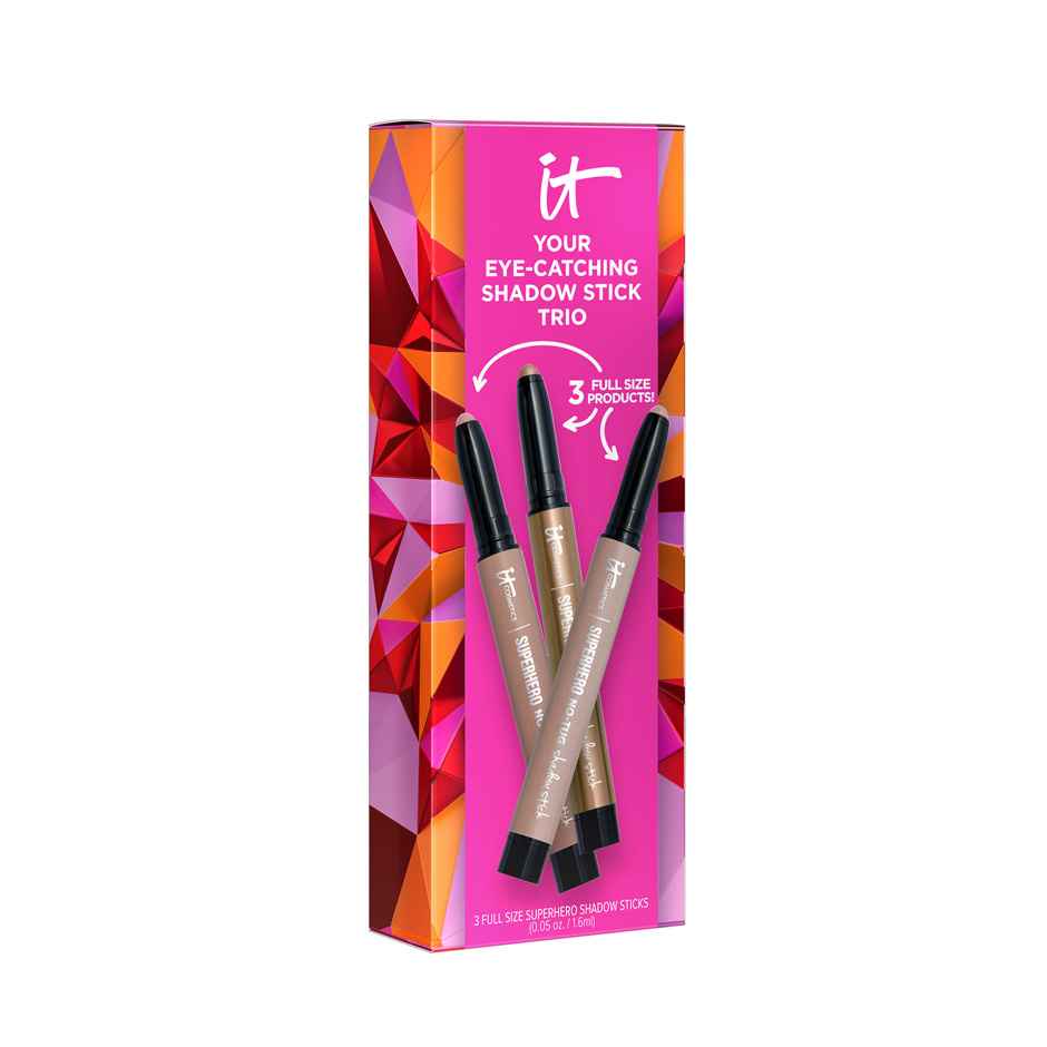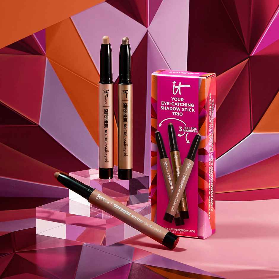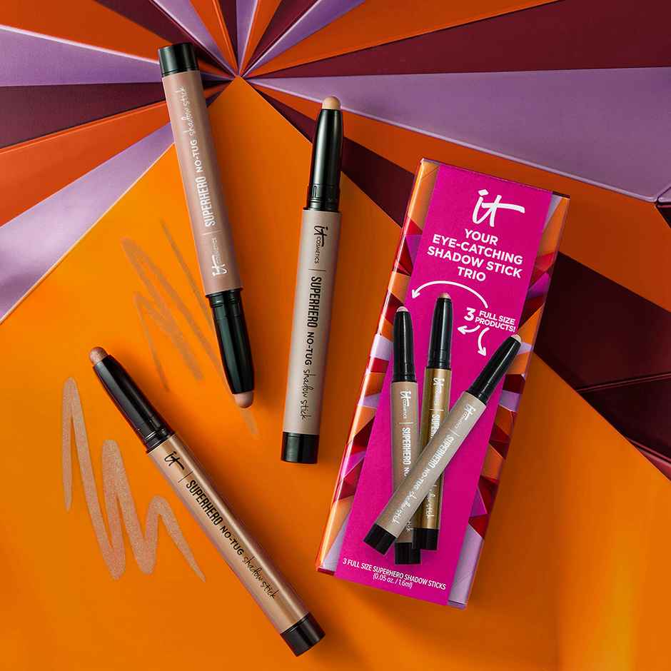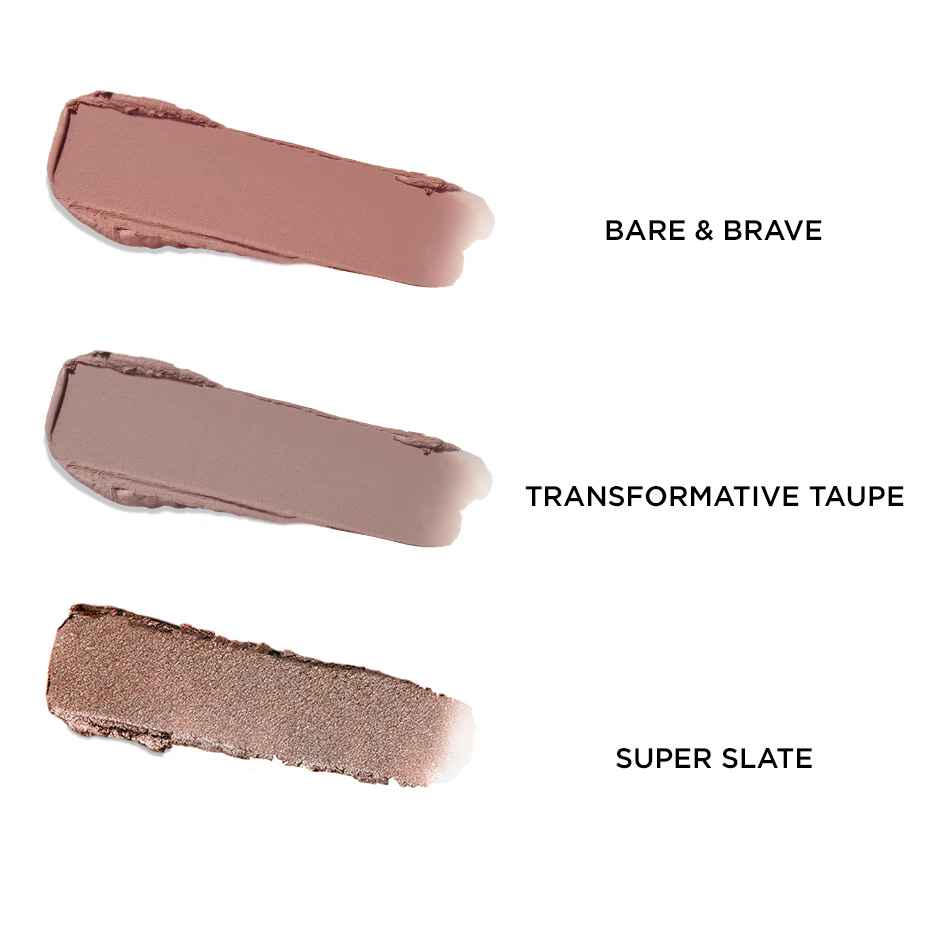 Get celebration-ready with your limited-edition trio of super eyeshadow sticks! This cream shadow stick gift set includes full sizes of a few of our best-selling shades in matte and pearl finishes: Super Slate (pearl taupe), Transformative Taupe (matte light taupe) and Bare & Brave (matte rose). Fea...more