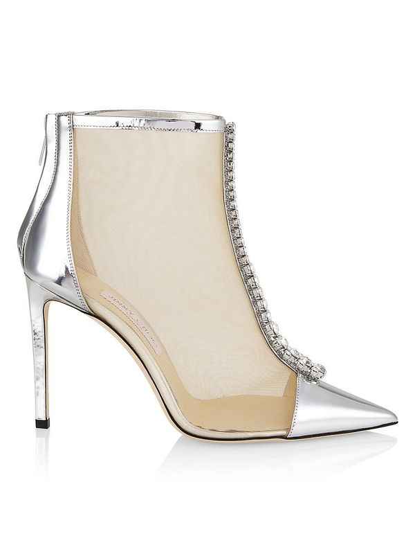 Jimmy Choo's Bing booties are crafted of crystal-embellished mesh with metallic leather detailing. Textile/leather upper Pointed toe Back zip Leather/rubber sole Made in Italy SIZE Heel height, 4 (100mm) ABOUT THE BRAND Designer Jimmy Choo made his start with a made-to-order shoe boutique in London'...more