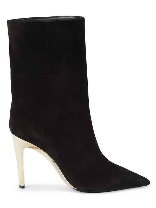 A slender contrasting heel accentuates these chic suede booties. Suede upper Point toe Pull-on Lining: Leather Synthetic sole Made in Italy SIZE Covered stiletto heel, 4 (102mm) Shaft, about 5.25 Leg opening, about 9.75. Shoes - W Designer Shoes > Saks Off 5th > Barneys Warehouse. Jimmy Choo. ...more