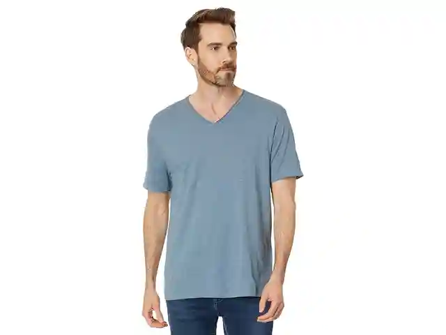 Add a timeless backdrop to your outdoor look wearing the John Varvatos Miles Tee. It features a V-neckline with short sleeves and a rounded hem. Regular fit. Pullover style. 100% cotton. Machine washable. Imported.