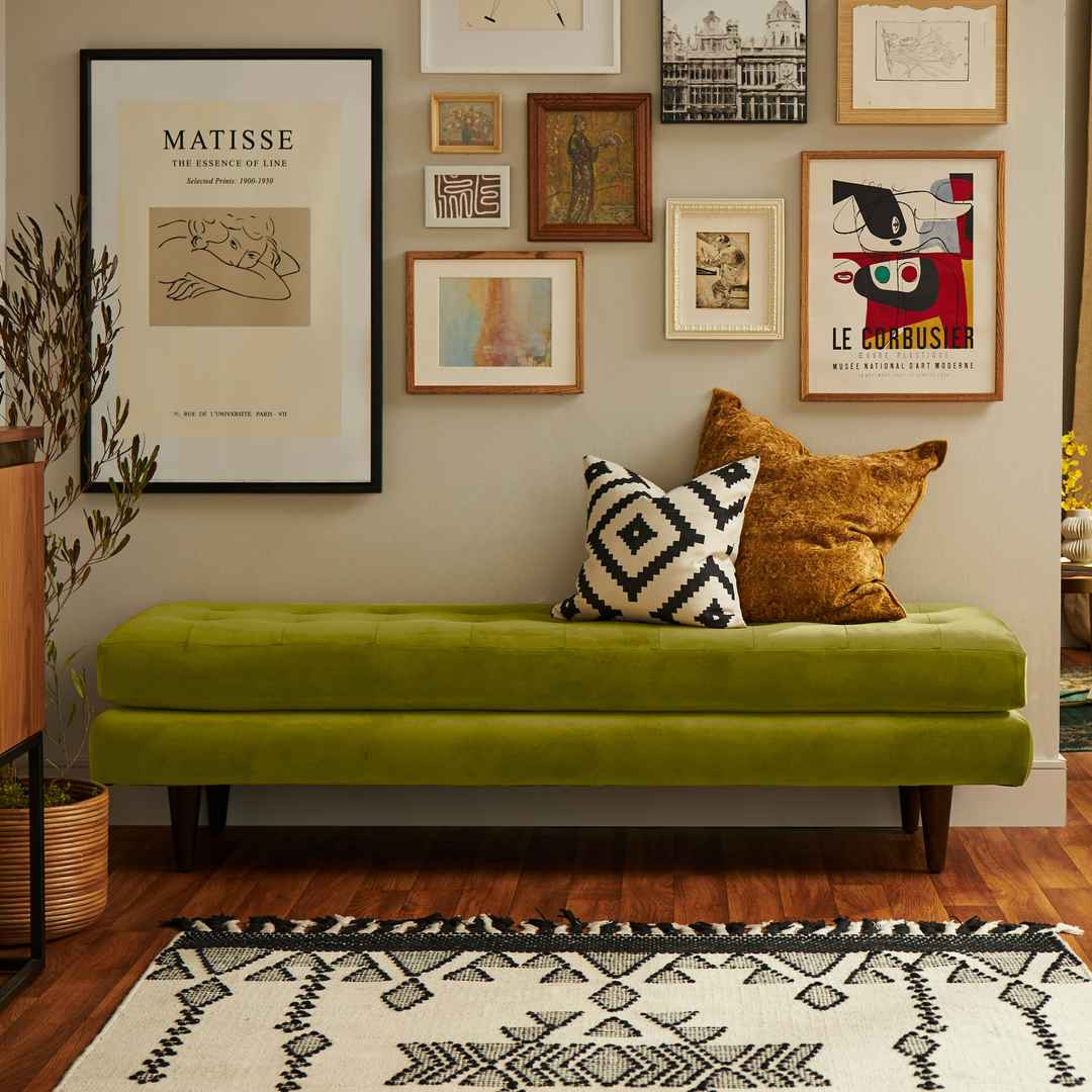 Great for entryways and corner nooks, the Eliot Bench promises to refresh your space through a unique blend of cozy charm and vintage vibes. Eliot Bench Leuven Olive Green Mid-Century Modern