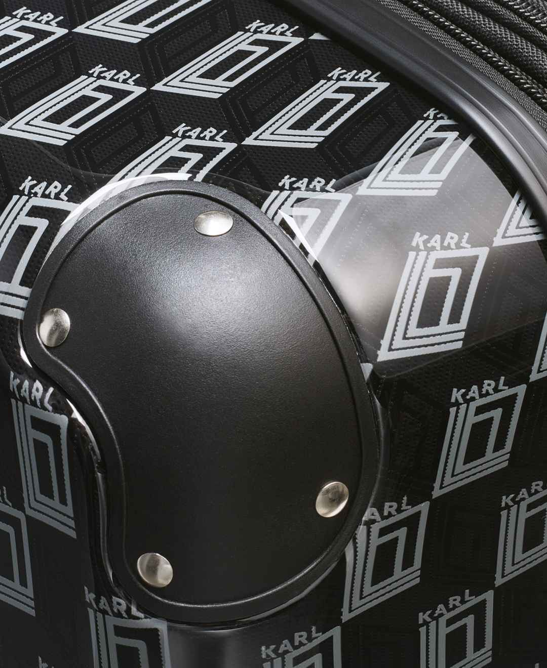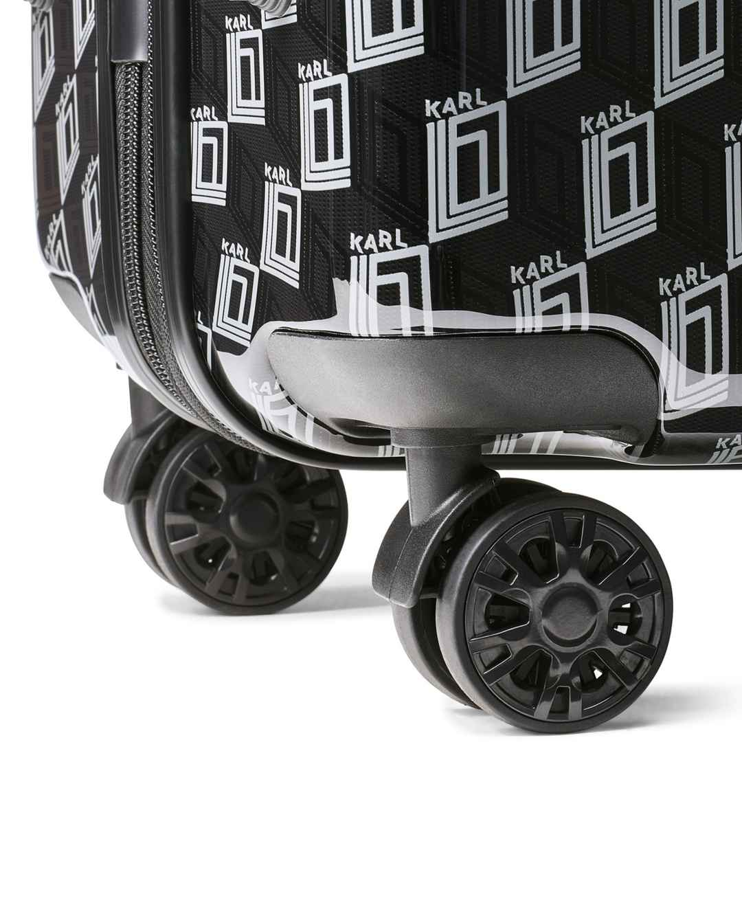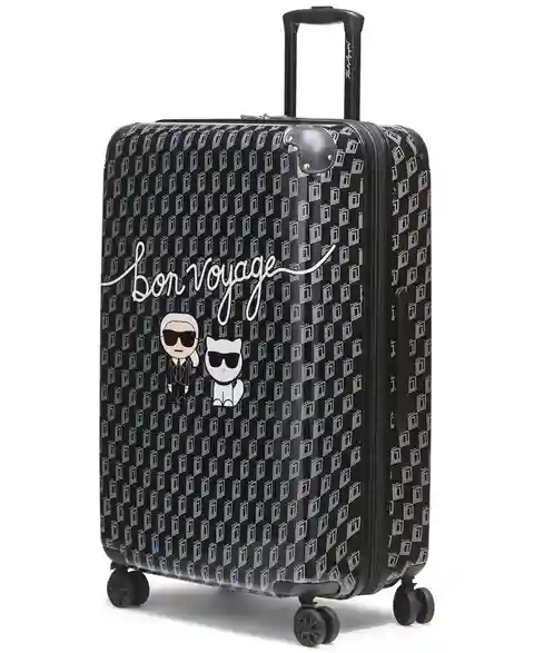 The Bon Voyage a Box Collection features a push button trolley system and spinner wheels that glide you to your destination, an expansion feature that makes additional room for all your souvenirs, Signature Karl graphic design and a fully lined interior. Fun, Fashion and Function, all in one.
