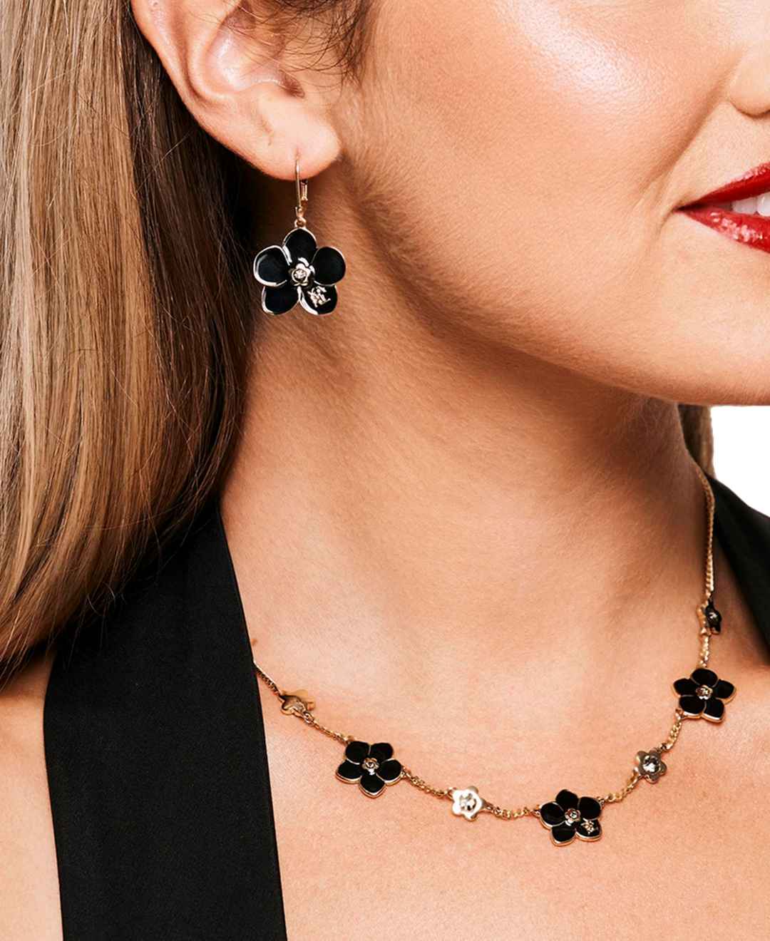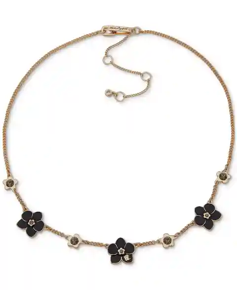 An instant mood makeover from Karl Lagerfeld Paris, this frontal necklace pairs golden links with black flowers.