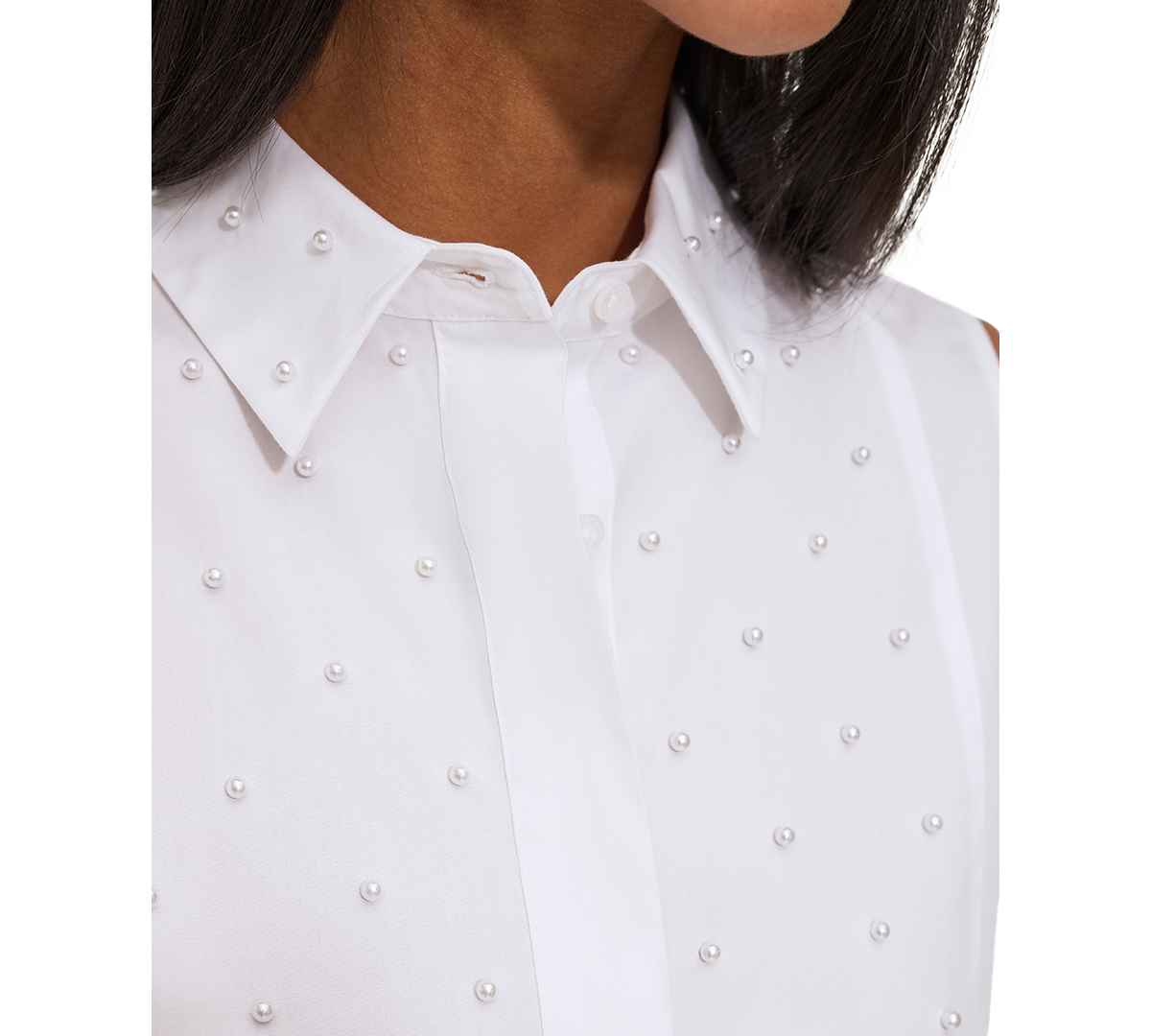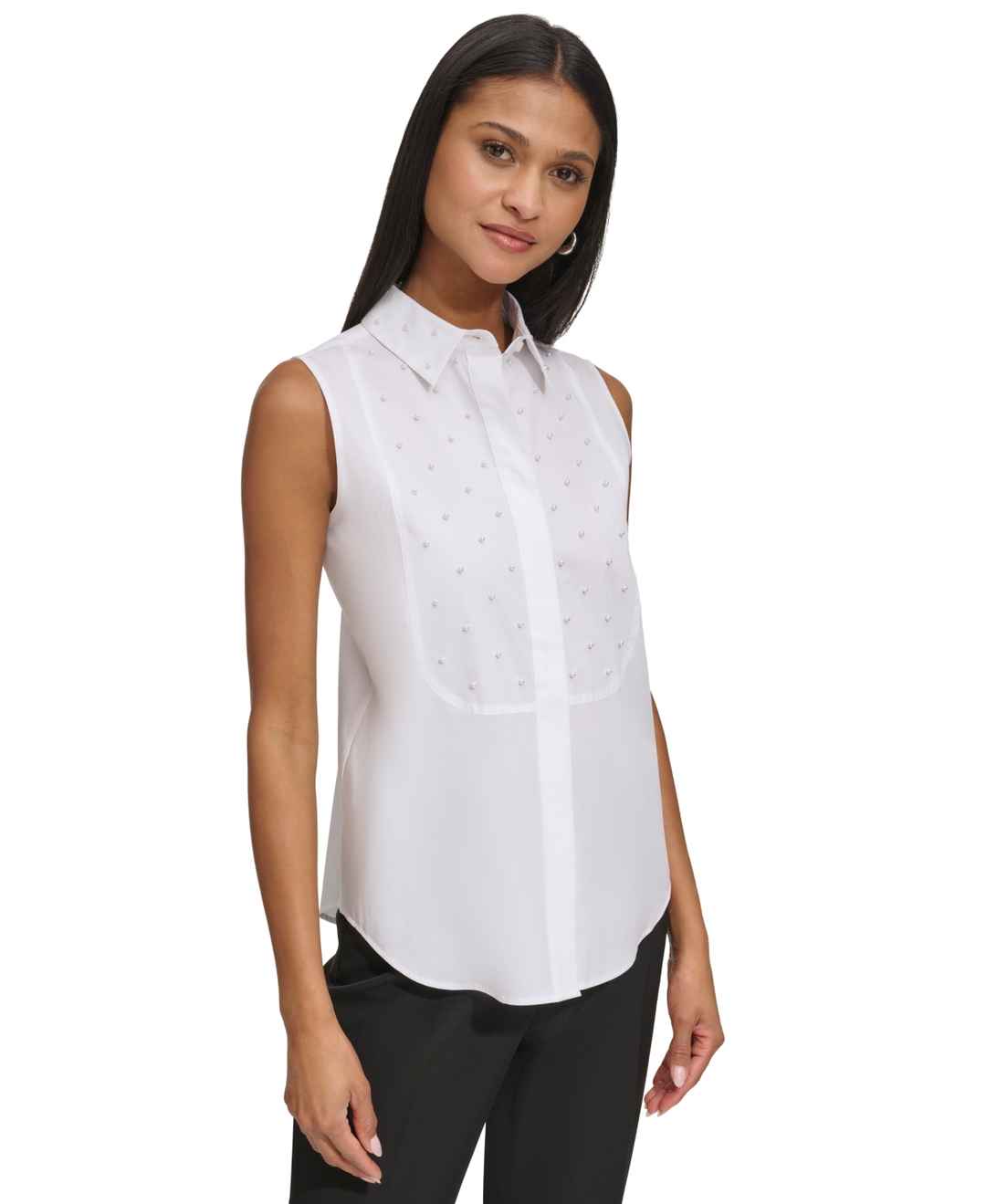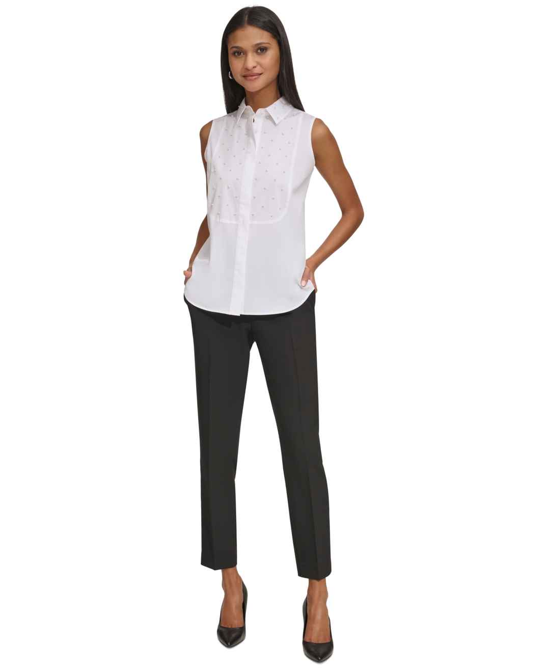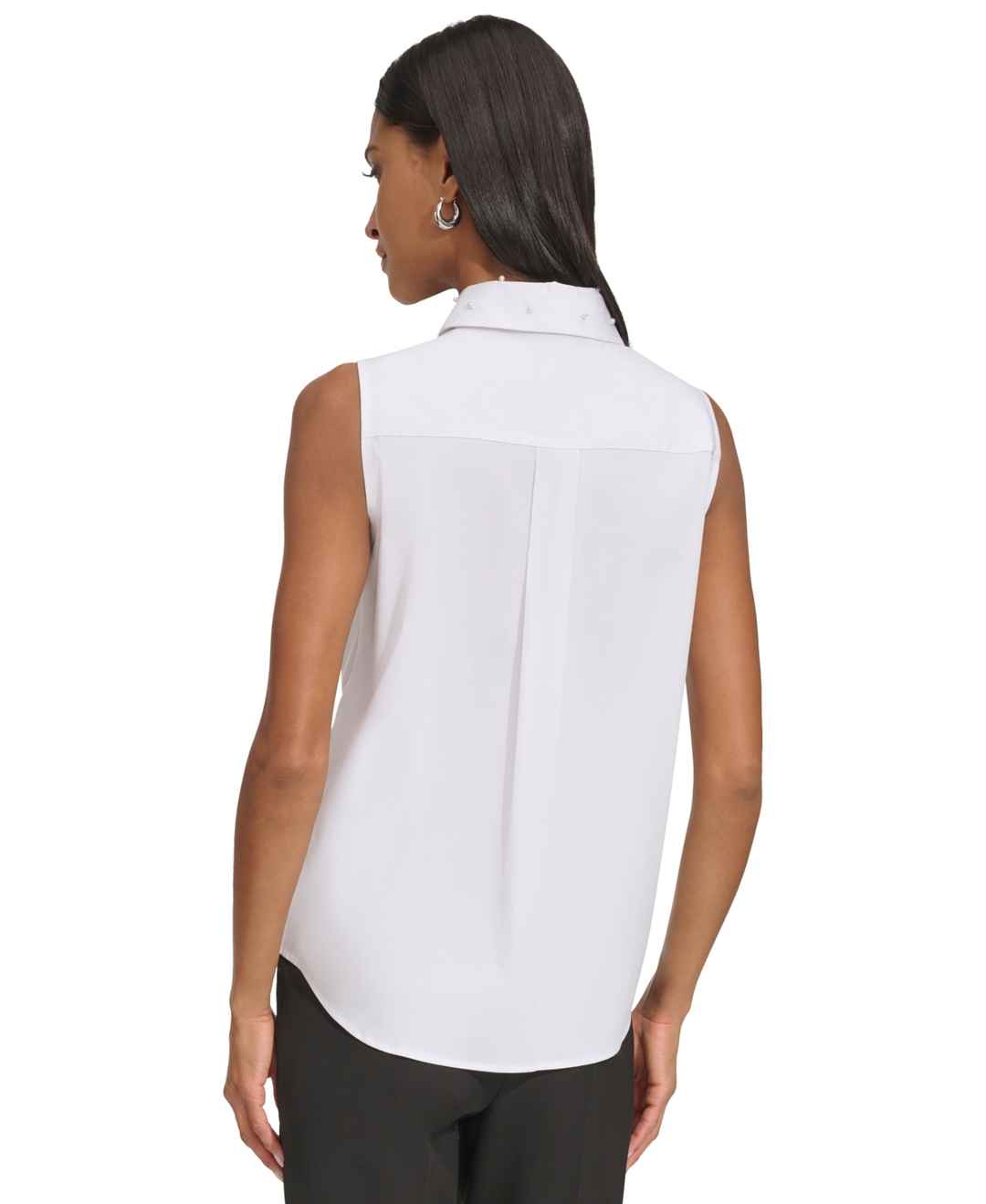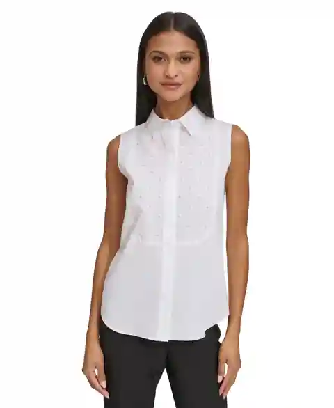 Be the image of chic in Karl Lagerfeld Paris' embellished sleeveless shirt.