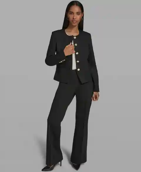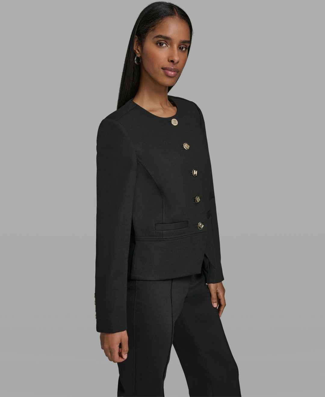 Tailored structure and sleek detailing define this cropped jacket from Karl Lagerfeld Paris. Designed with a round neckline, long sleeves, and subtle shoulder padding, it creates a refined silhouette, finished with a five-button closure and waist pockets for a polished look.
