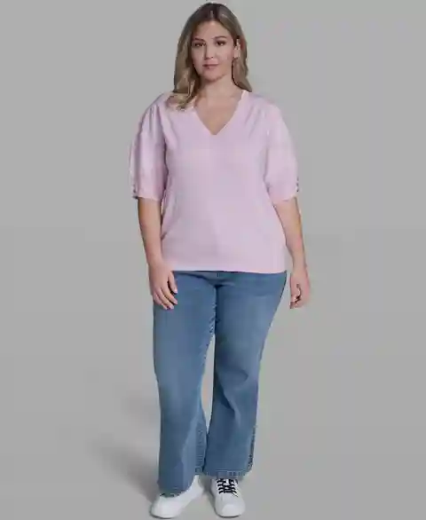 Add floral charm to your sleeve with this short-sleeve sweater from Karl Lagerfeld Paris, designed with a V-neck. The pull-on style creates a flattering, effortless look for daytime wear.