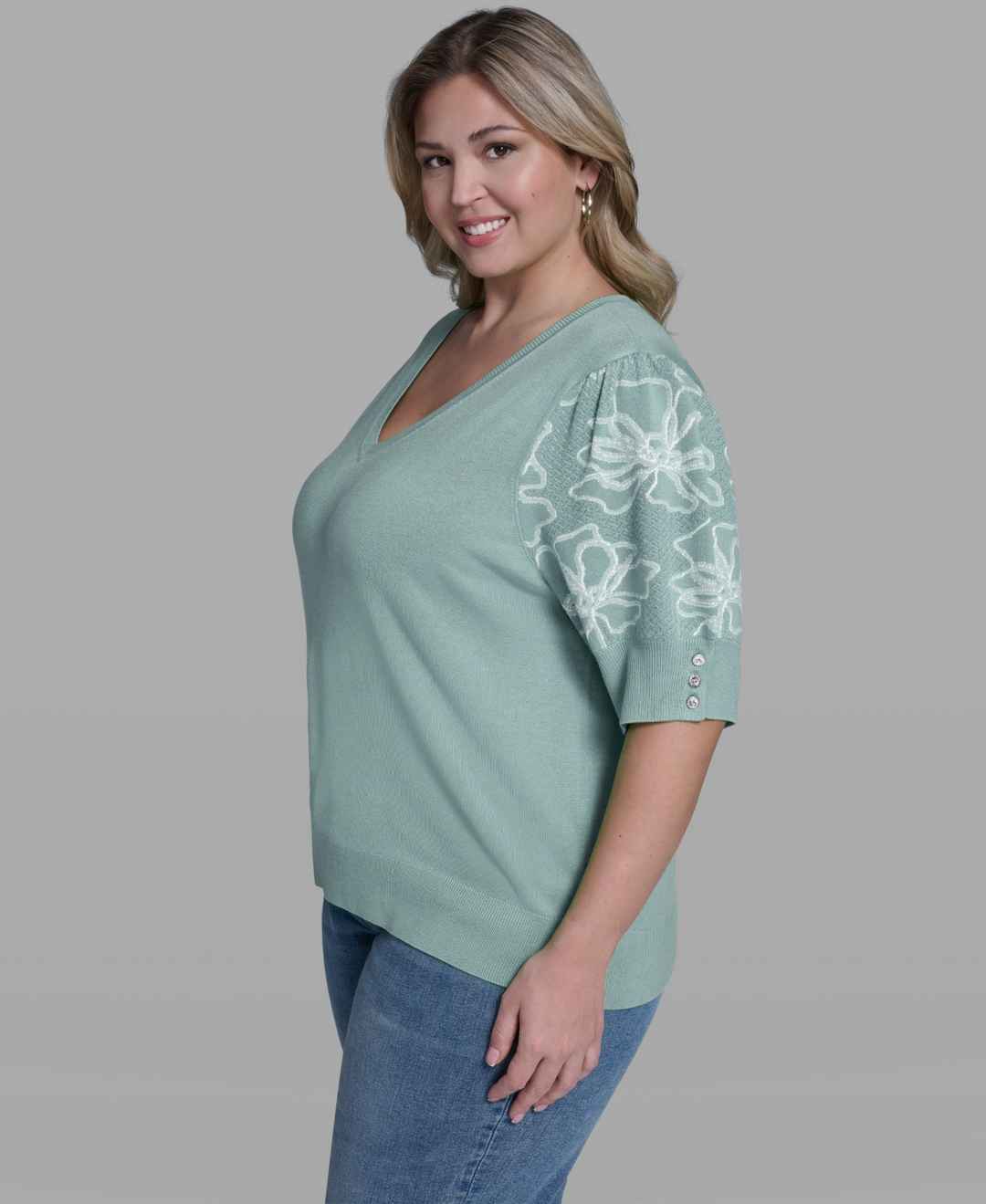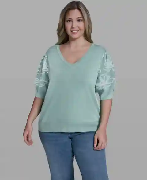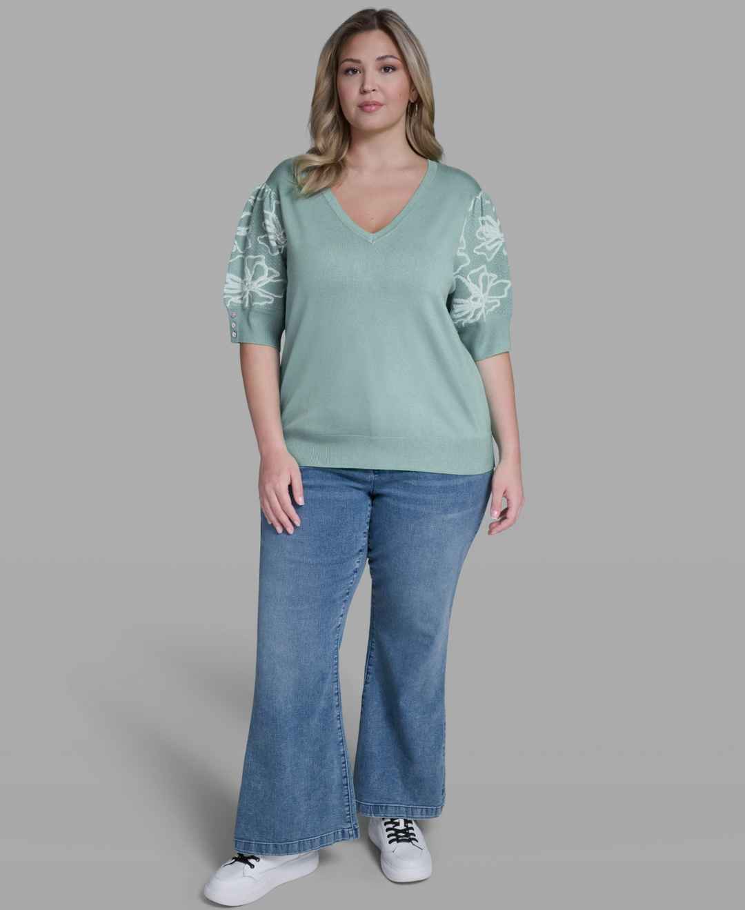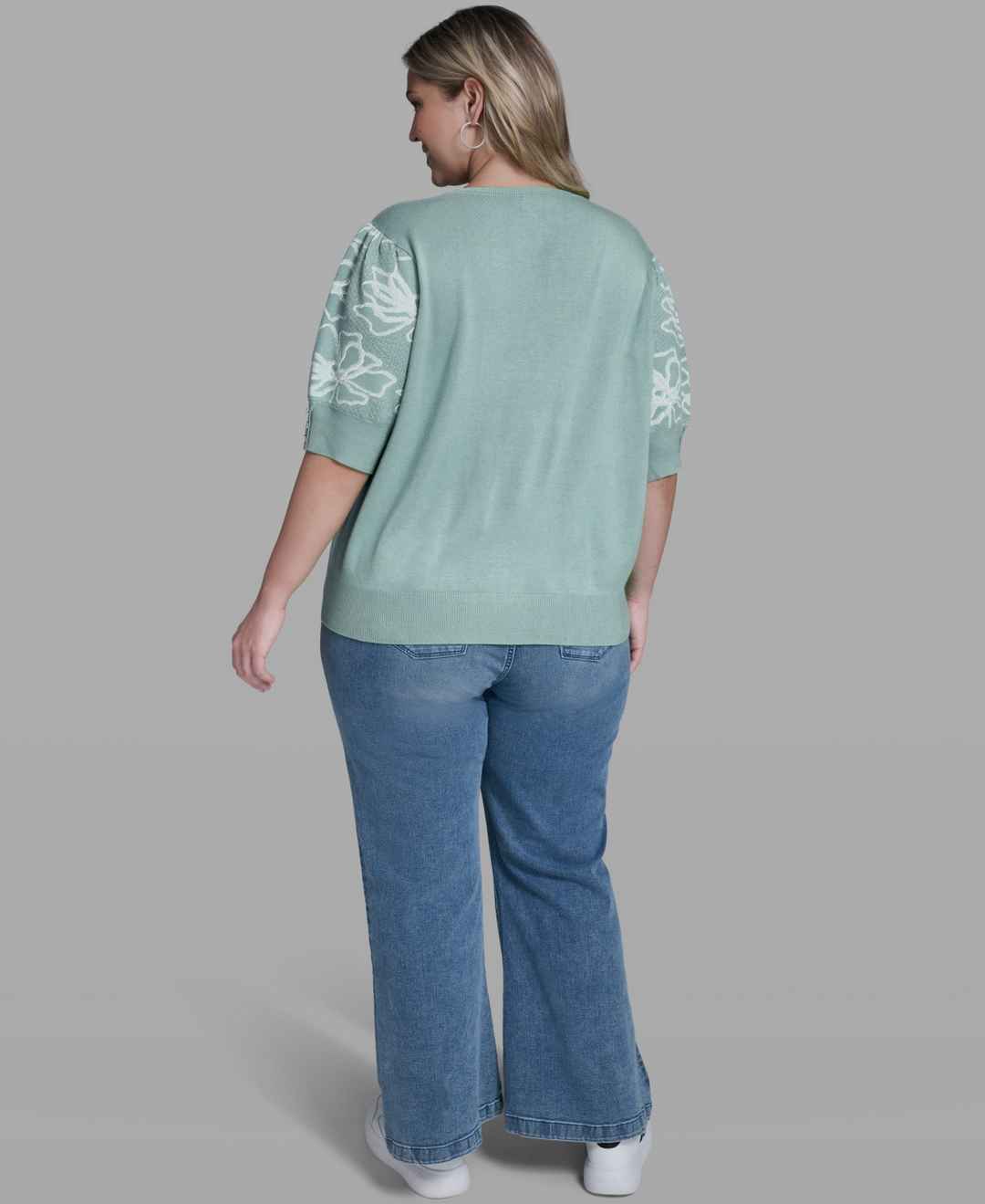 Karl Lagerfeld Paris Plus Size Floral Printed Sleeve Sweater - Fresh Mint