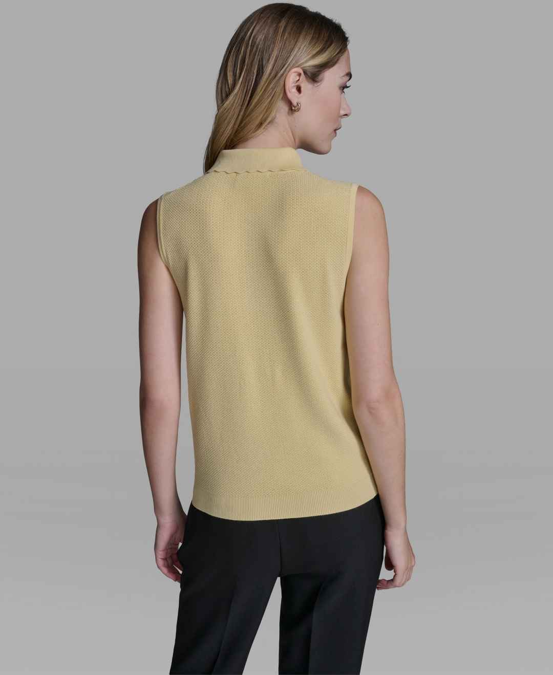 Add a touch of modern sophistication with this Karl Lagerfeld Paris sleeveless sweater, designed with a refined collared neckline and button closure at the neck. The hip-length cut makes it suitable for polished layering.