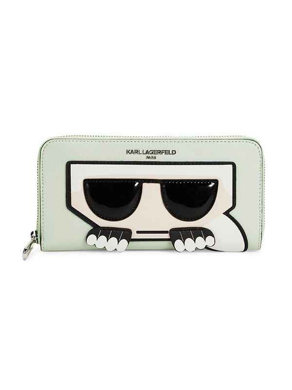 The iconic designer mimics a Kilroy-like pose on this sleek faux leather continental wallet with playful patch design. Zip-around closure Goldtone hardware Exterior back slip pocket Interior zip pocket Two interior bill compartments Eight interior card slots Lined Polyurethane Imported SIZE 8W x 4H ...more