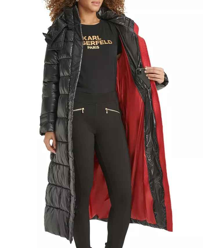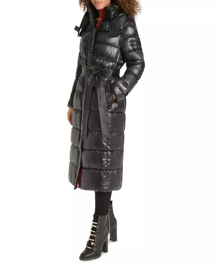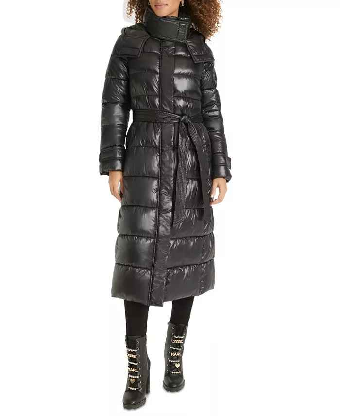 A sleek maxi length and a waist-defining belt come together flawlessly on this hooded down puffer coat from Karl Lagerfeld Paris.