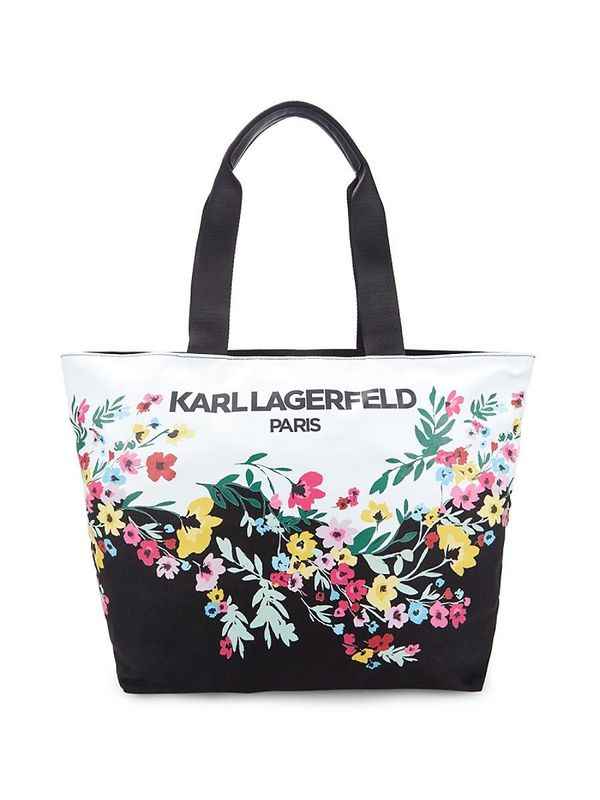 Fashionable cotton canvas tote with graphic logo detail and stripes on the front. Top zip closure Polyurethane trim Goldtone hardware One inside slip pocket Cotton canvas lining Cotton canvas Imported SIZE Double top faux leather with textile straps, 9 drop 18W x 14H x 6.5D. Center Core - Handbags/s...more