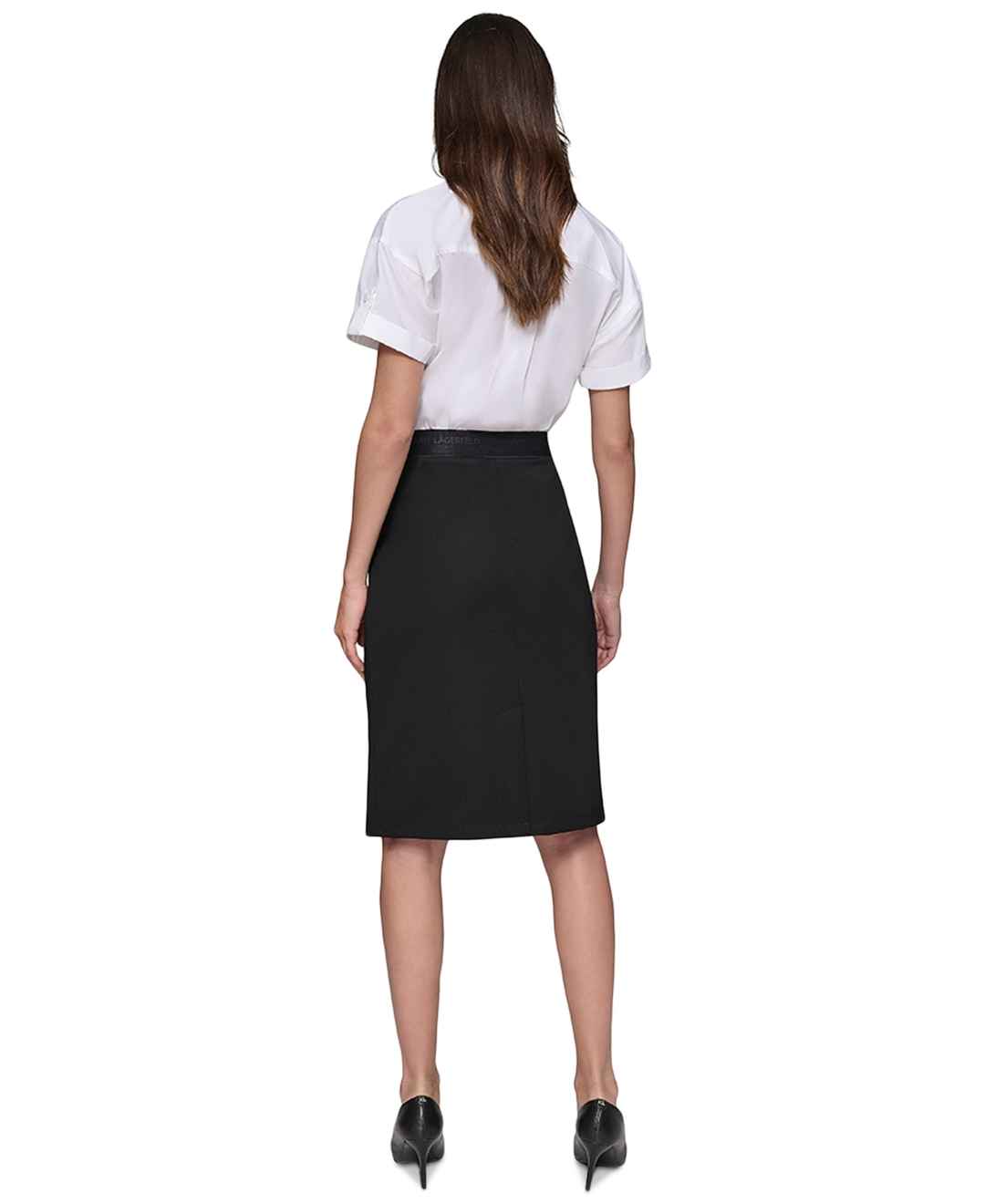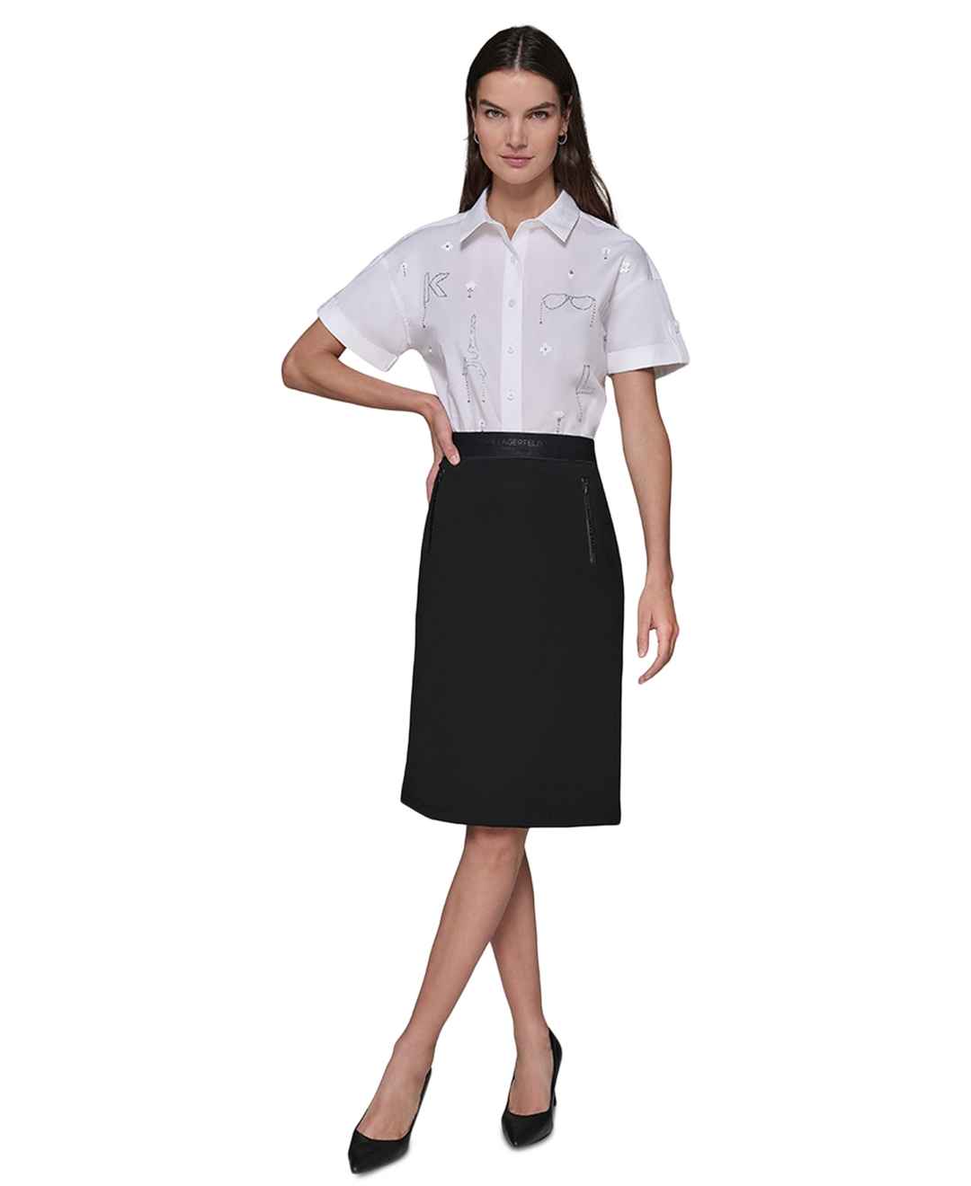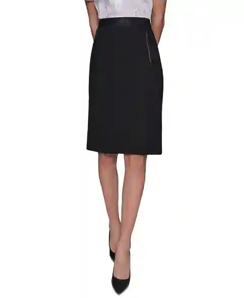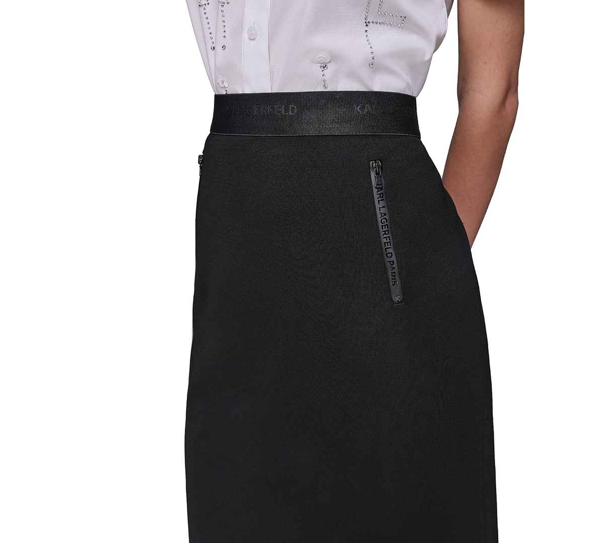 A pull-on with polish. This straight skirt from Karl Lagerfeld Paris features a signature waistband and zip pockets at the front.