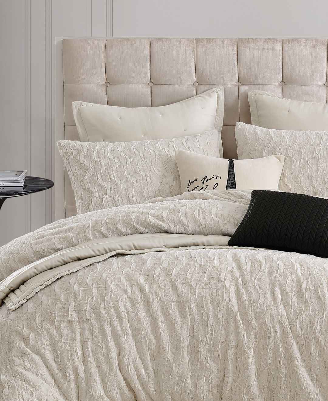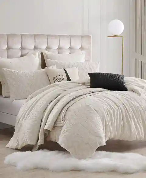 Make every night a dream with the Karl Lagerfeld Paris heavenly faux fur comforter. Luxurious faux fur in a rich ivory color will make your bed the center of attention. The printed reverse adds a modern cool touch to this glamorous bedding.