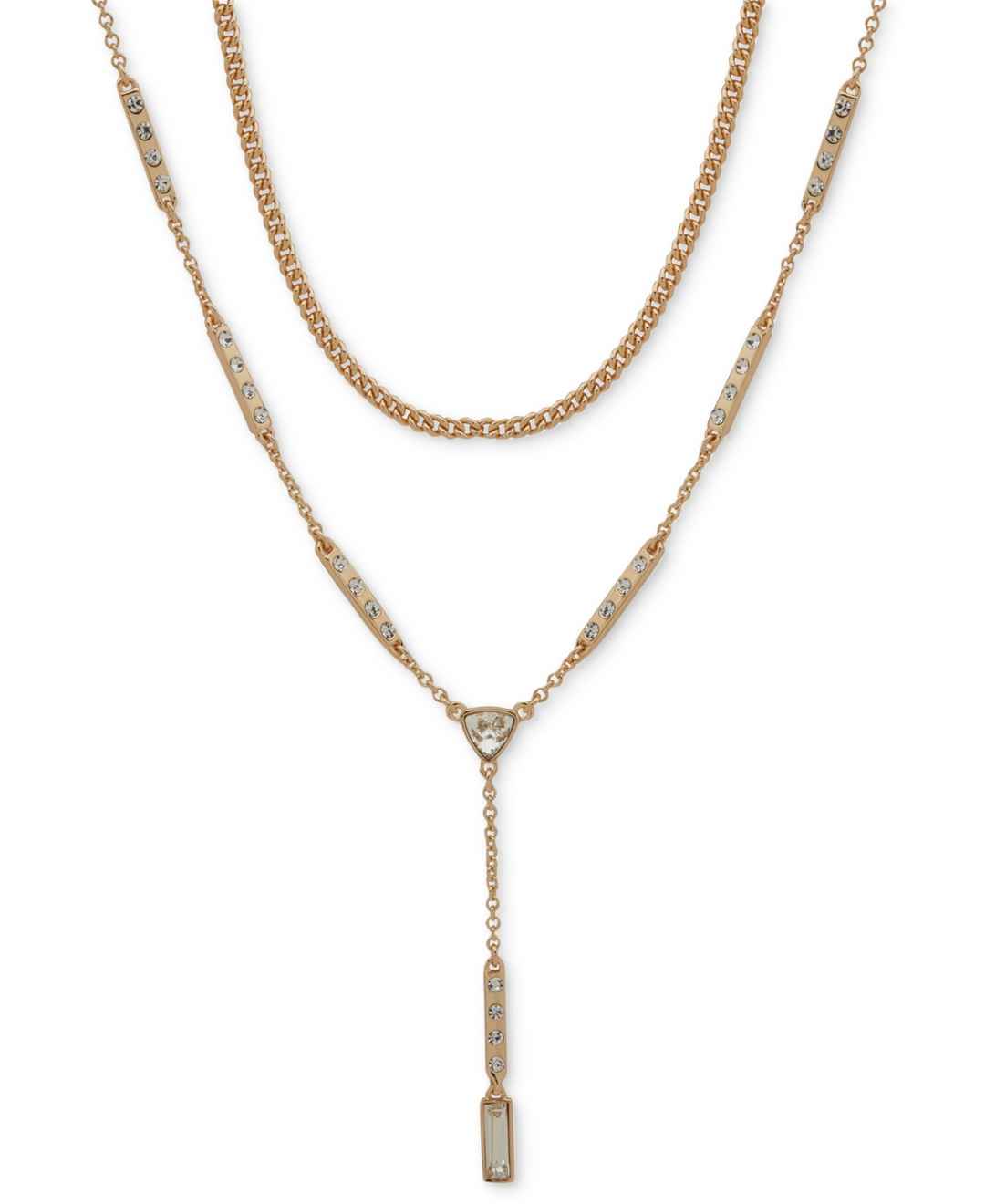 A layered lariat necklace with a geometric theme, this Karl Lagerfeld Paris favorite shines with glistening crystals.