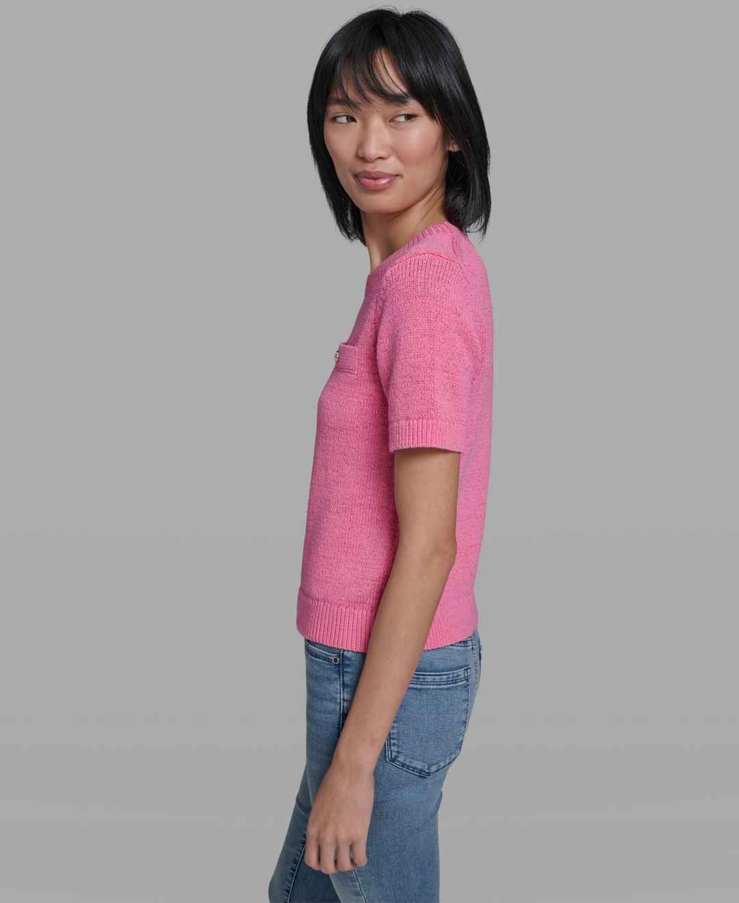 Update your wardrobe with this Karl Lagerfeld Paris sweater, featuring a classic crewneck and short sleeves. The two chest pockets add functional detail to the timeless design.