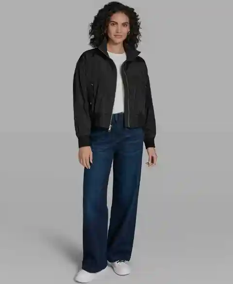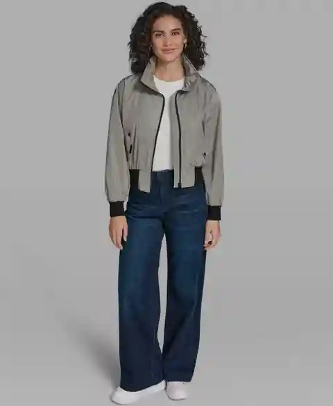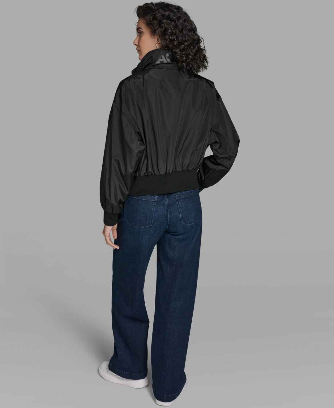 Elevate your style with this Karl Lagerfeld bomber jacket featuring a short silhouette, knit collar and cuffs, and hidden hood at the collar. Flap pockets add practicality, while its design makes it ideal for layering during fall fashion. A must-have women's jacket for casual yet stylish wear.