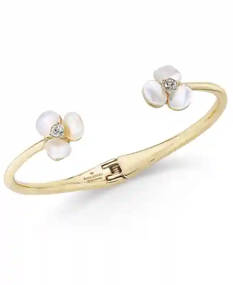 Mother-of-pearl petals are accented with a sparkling pave crystal on the ends of this hinged slim cuff bracelet by kate spade new york, designed in gold-tone mixed metal. Approximate diameter: 2-1/2".