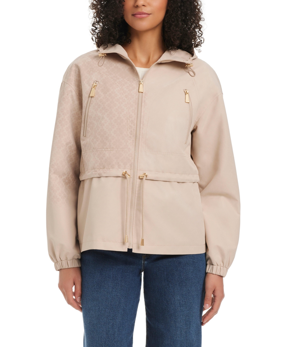 Cropped anorak rain jacket shows a magic print when wet. Attached hood and exposed teeth zips add edgy utility. Drawstring detail at hood and waist for a custom fit rib-knit cuffs to seal warmth. Style it with high-waisted jeans or joggers. Cbl: 24" size S.