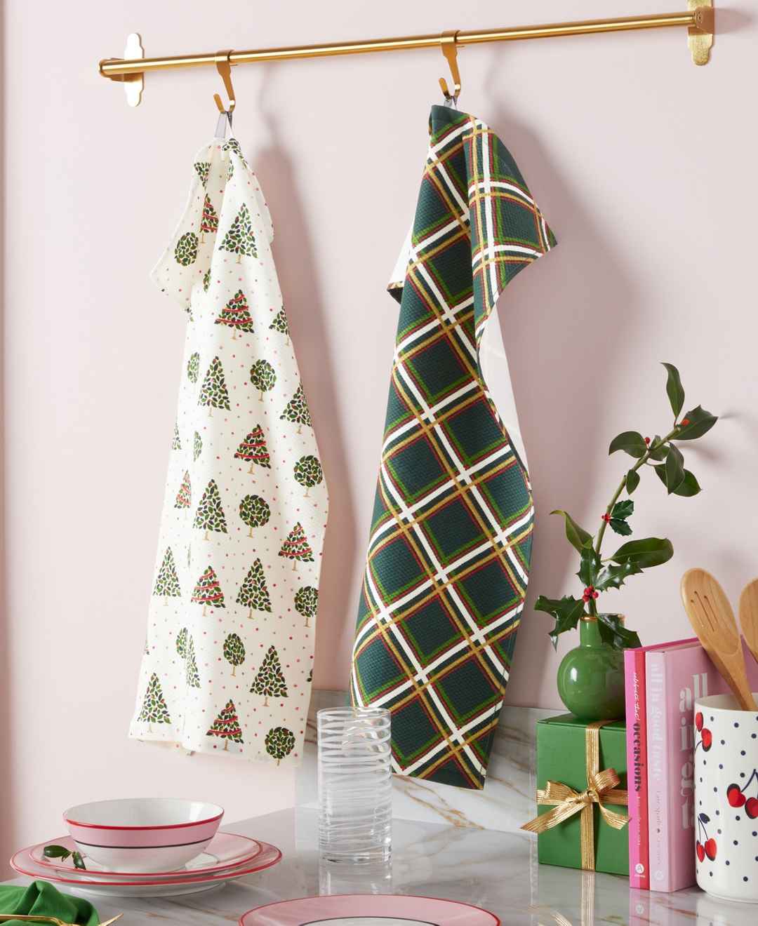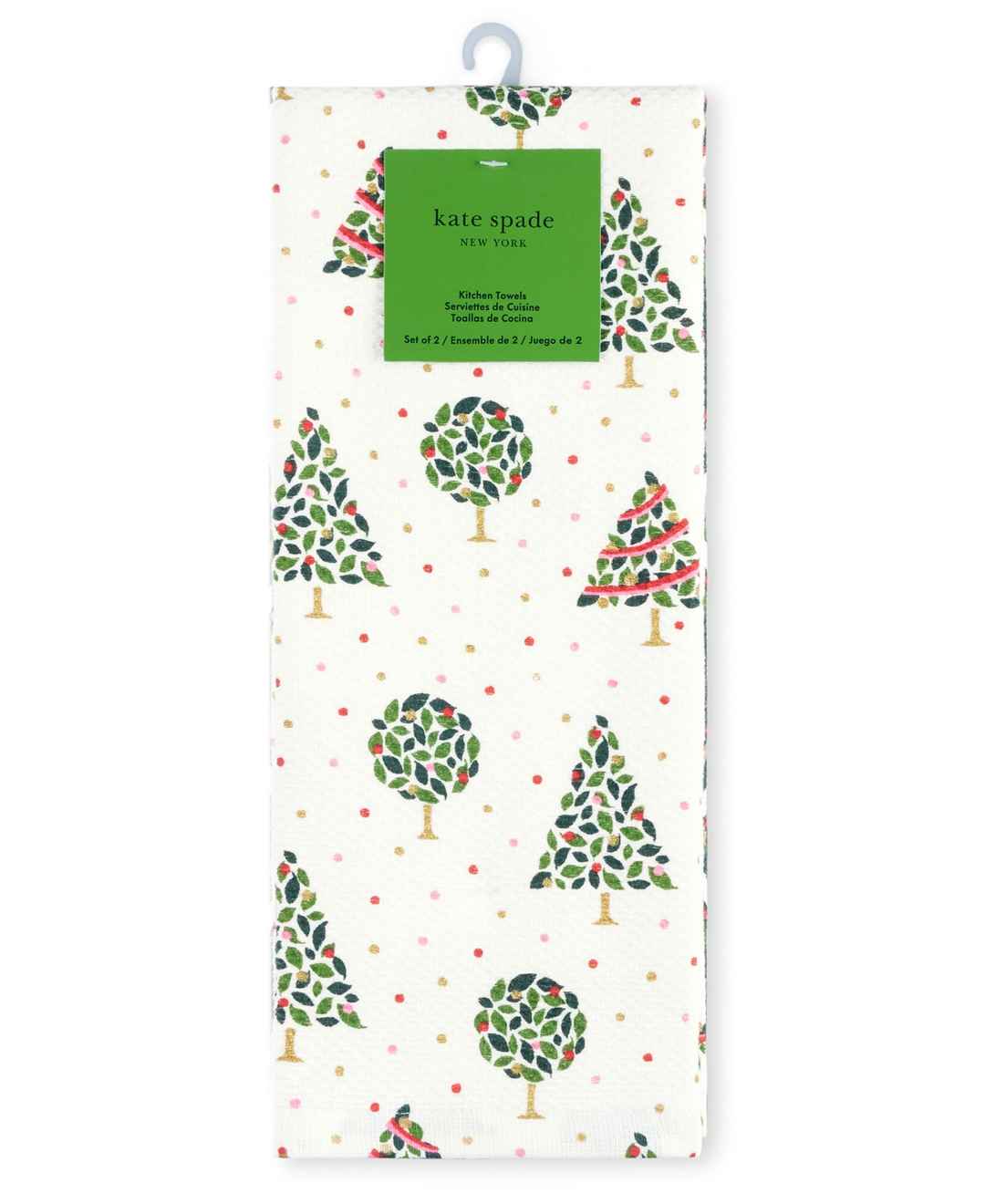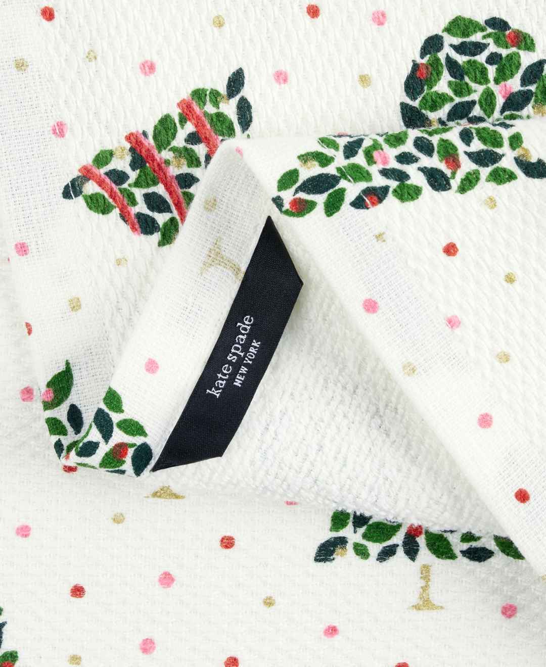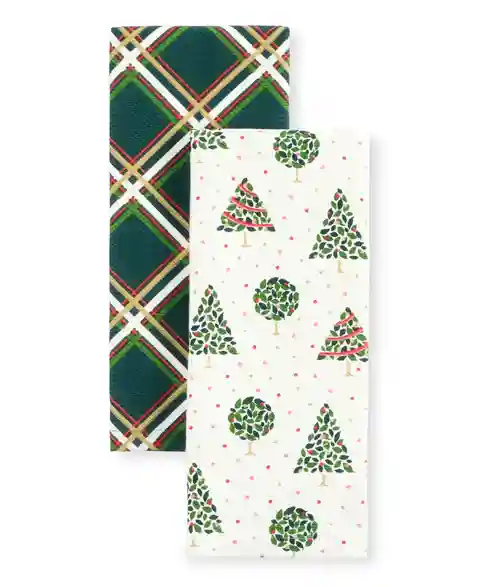 Add some holiday cheer to your kitchen with the kate spade new york holiday confetti acrobat plaid kitchen towel 2-pack set. This festive kitchen set features two kitchen towels measuring 17" x 28". Made of 100% cotton with gold-tone metallic pigment, these Christmas kitchen towels are both decorati...more