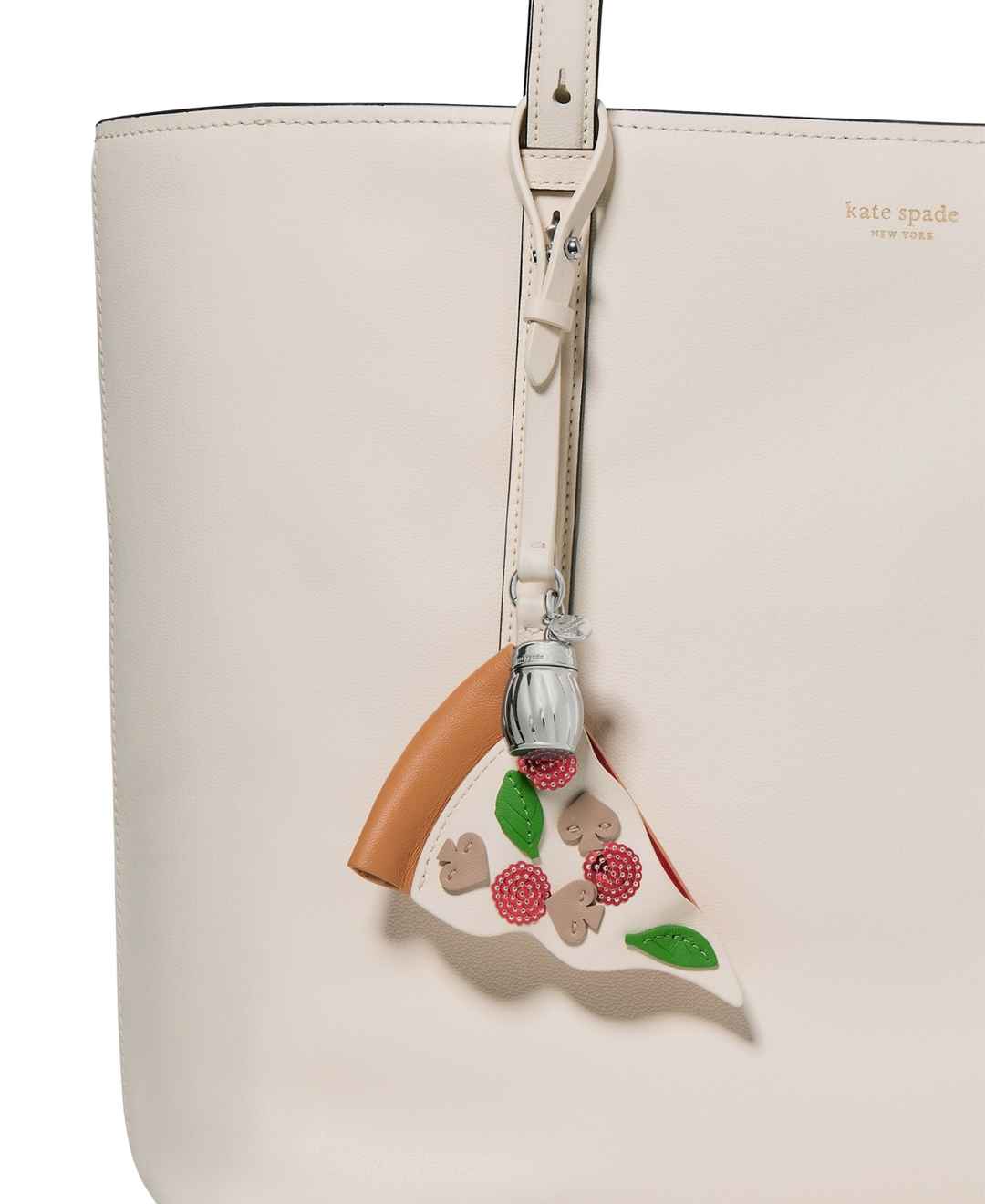 Bring a slice of New York style to your collection with this pizza bag charm from kate spade new york, featuring a leather loop closure and playful detailing. Decorative elements add visual interest to this fun accessory.