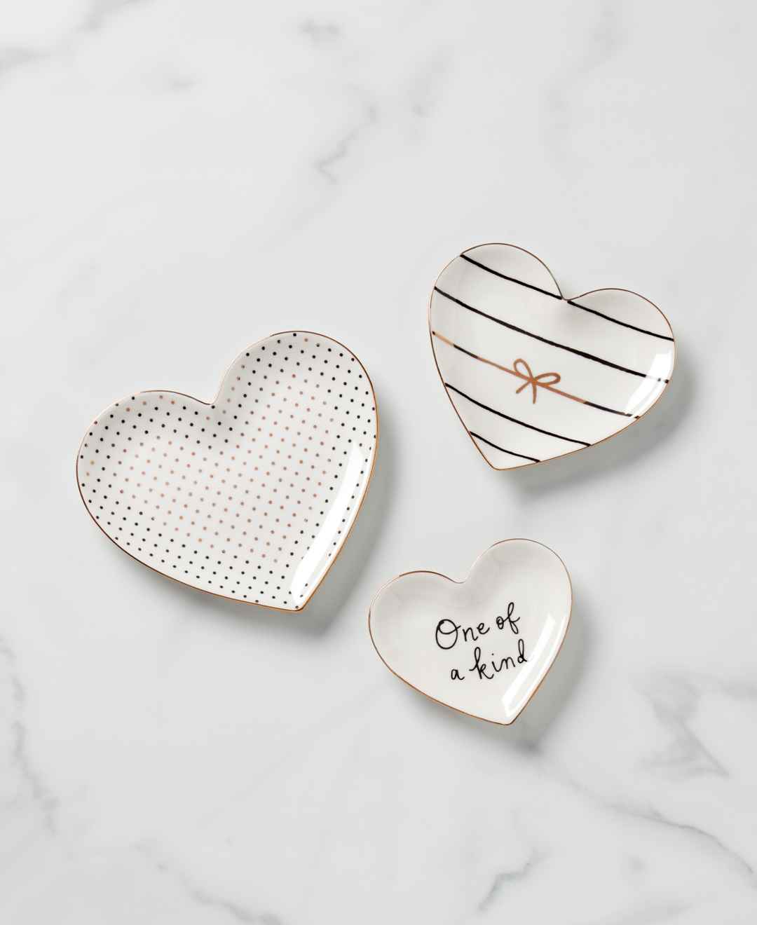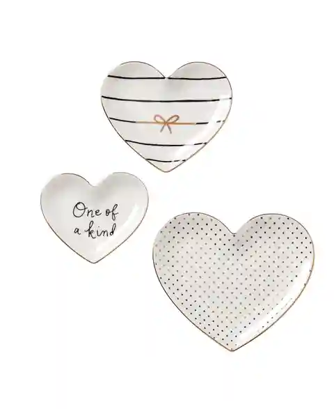 How sweet a set of heart shaped dishes for any type of jewelry or trinket. Including three stackable sizes and elegant gold-tone, silver-tone, and black designs.