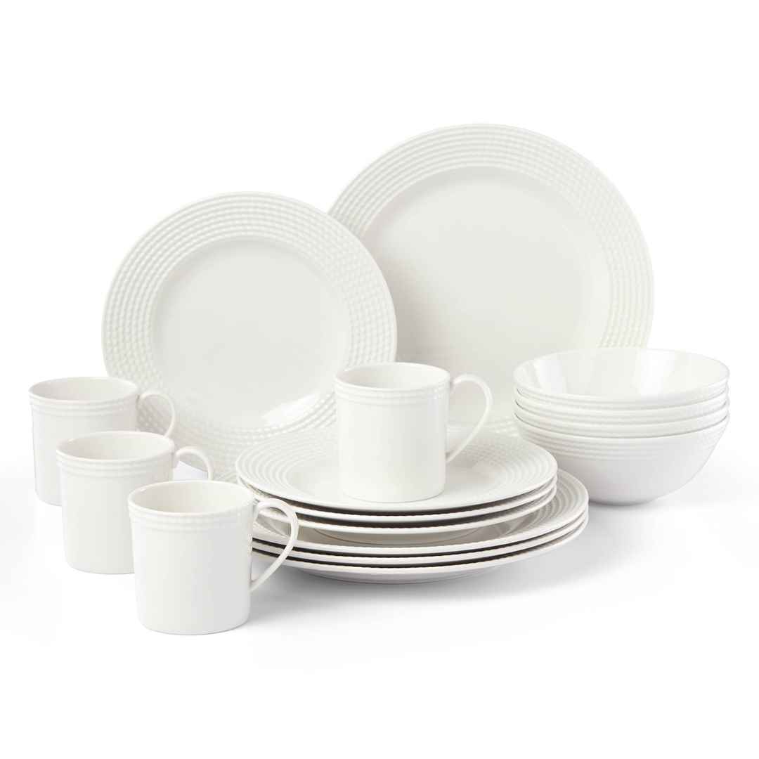 Dine with the Wickford 16pc dinnerware set and tie in timeless sophistication with every meal. Versatile white porcelain in contemporary shapes is embossed with a twisting rope design. Set includes (4) four each: dinner plate, accent plate, soup/cereal bowl and mug. Dishwasher and Microwave Safe