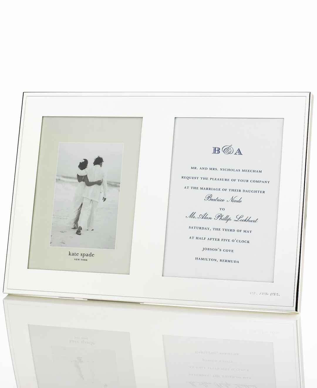 Polished to a lustrous mirror-like finish, this elegant double invitation frame is crafted in silver-plated metal, lending sheer radiance to your finest photos and memorabilia. With Mr. & Mrs. engraved in the bottom right corner. Holds two 5 x 7 photos side by side.