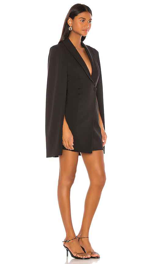 Katie May Boss Lady Mini Cape Dress in Black. - size S (also in XS) Katie May Boss Lady Mini Cape Dress in Black. - size S (also in XS) Self: 97% poly 3% spandex Lining: 100% poly. Dry clean only. Fully lined. Padded shoulders. Open sleeves. Exposed front button closure with keyhole accent. Made in ...more