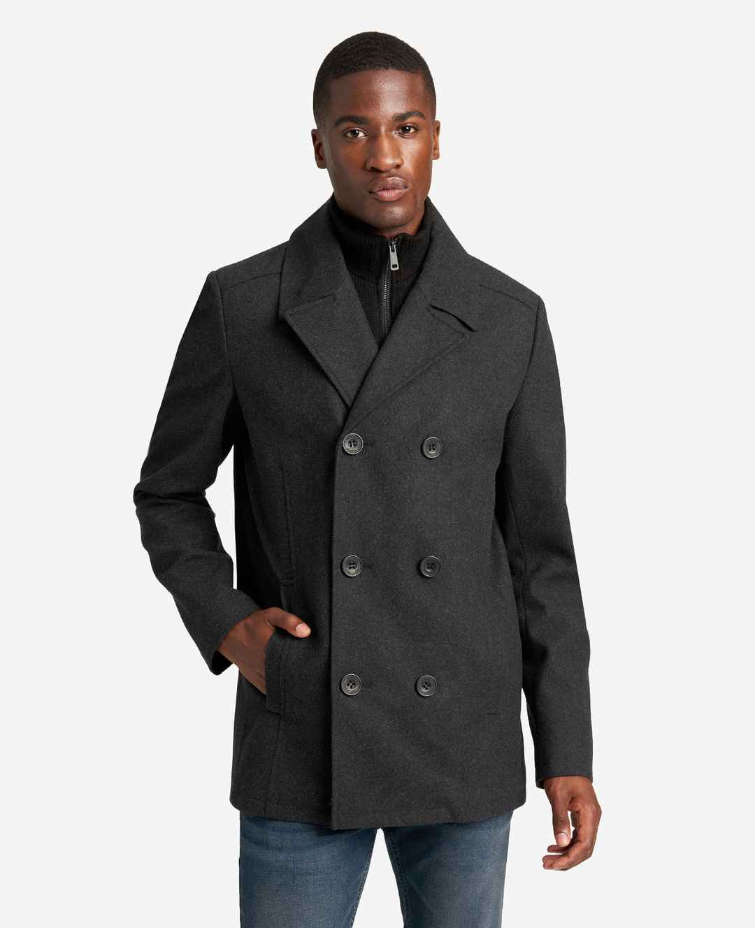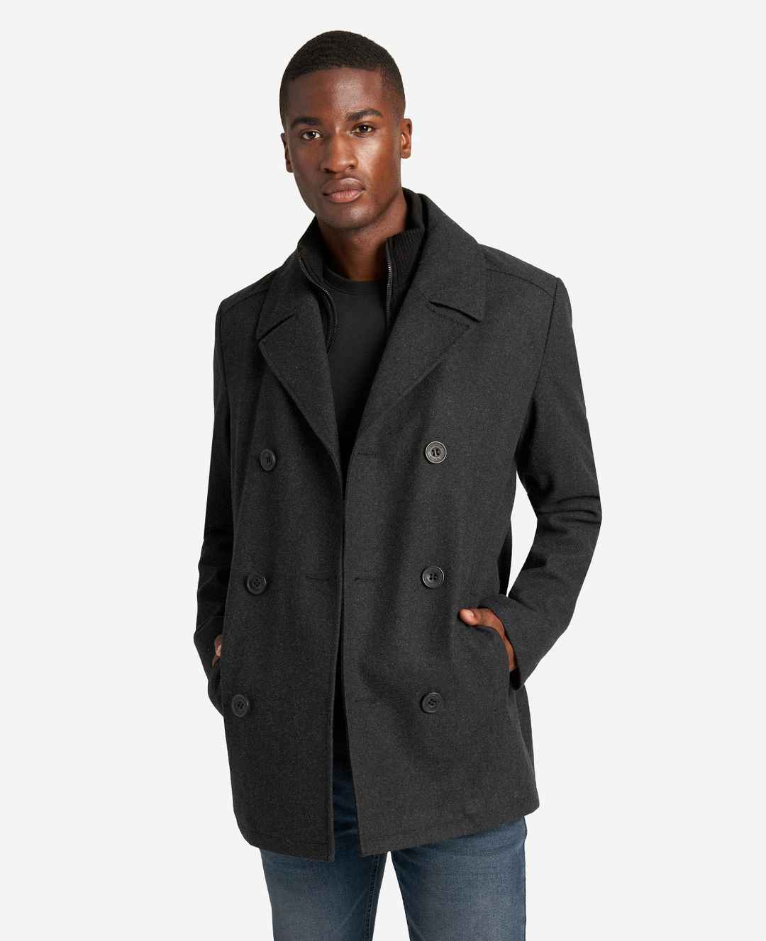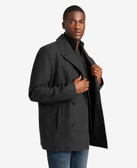 WHATS IN IT FOR YOU? Men's peacoat Notched Collar Rib knit inner bibe Double-breasted button-front closure Side seam pockets Branded detailing at sleeve Shell: 43% wool, 43% polyester, 5% acrylic, 3% cotton 3% rayon 3% nylonShell back: 100% polyurethane Dry clean only Imported | Kenneth Cole | Wool ...more