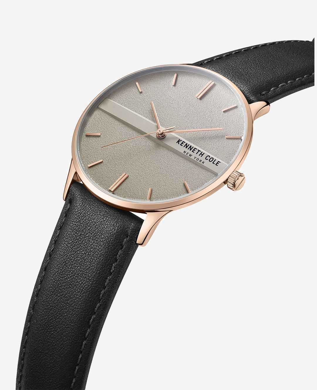 WHATS IN IT FOR YOU? Men's watch Rose gold-tone stainless steel round case with accented grey-tone dial Hour/minute/seconds hands in rose gold-tone finish Kenneth Cole logo detail Adjustable black leather strap for comfortable wear 5ATM water resistance 2-year battery life Imported | Kenneth Cole | ...more