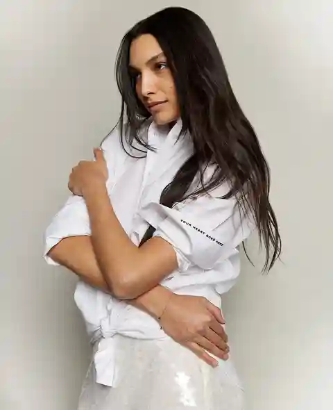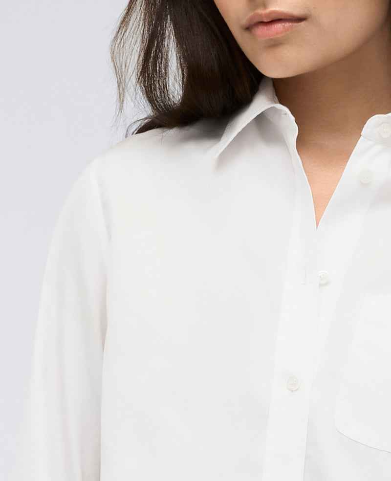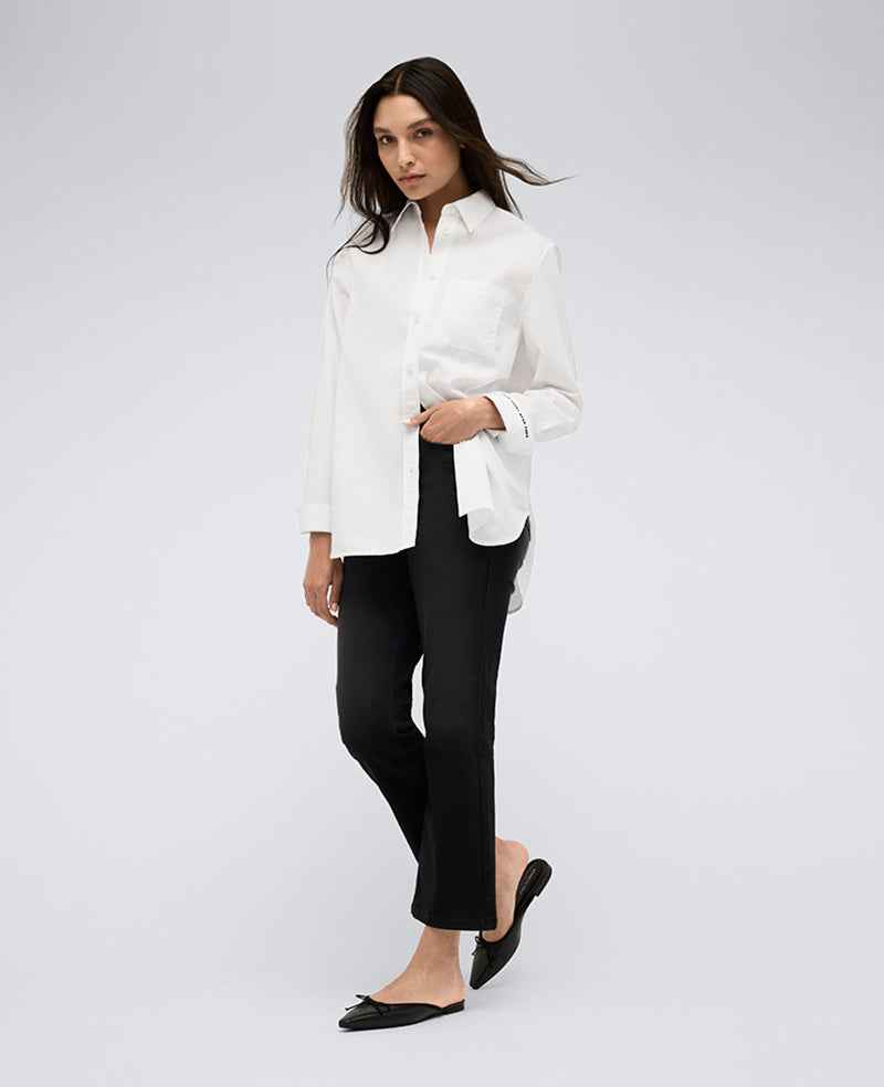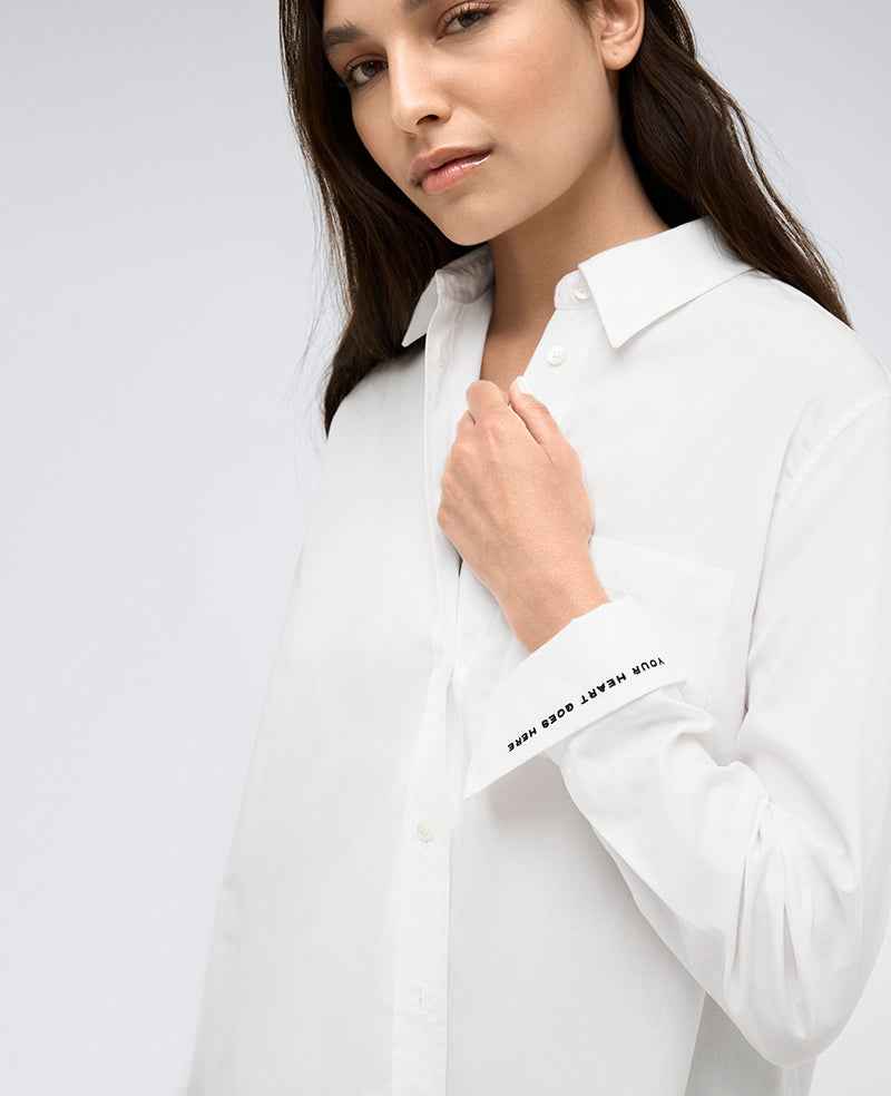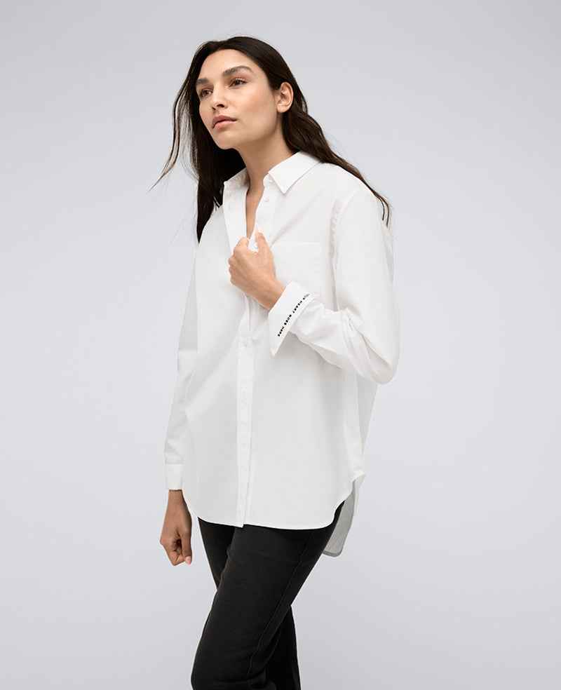 WHATS IN IT FOR YOU? Boyfriend button front shirt Oversized for a comfortable fit Point collar Chest patch pocket Long sleeves with button cuffs Roll up the left cuff to reveal embroidered text Button-down placket 70% cotton, 27% nylon, 3% elastane Machine wash Imported Model Specs: Height 5'9", Bus...more