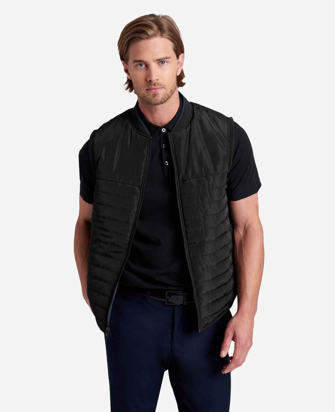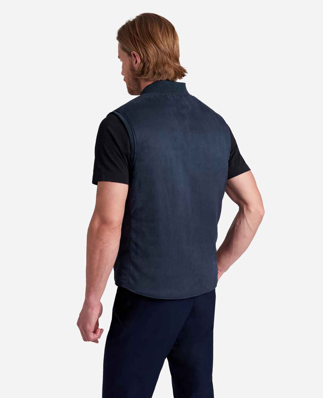 WHATS IN IT FOR YOU? Two-tone faux suede quilted vest Ribbed collar and cuffs for comfort Lightweight and insulated with plush material for a sleek look with a warm feel perfect for transitional weather Reversible for outerwear versatilty Side welt pockets Full-zip closure Curved hem for easy layeri...more