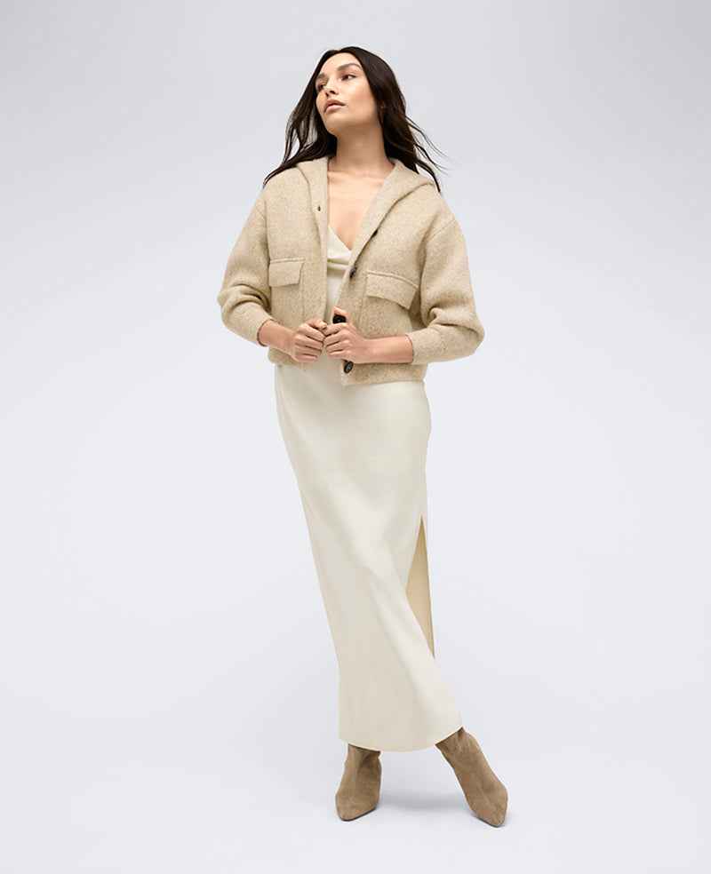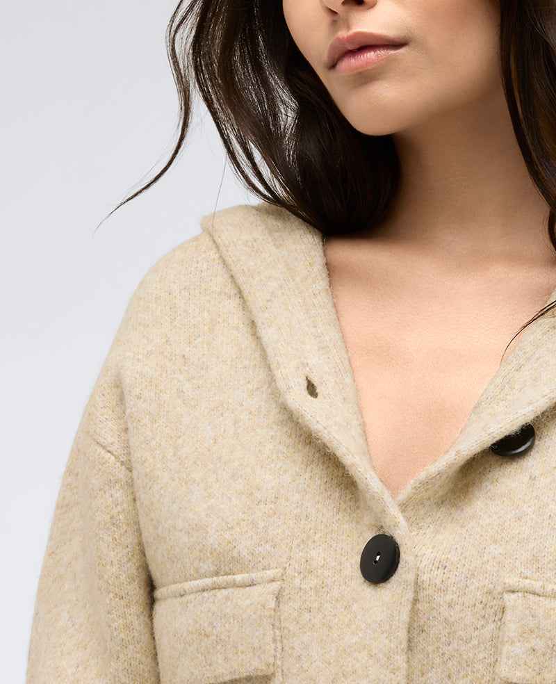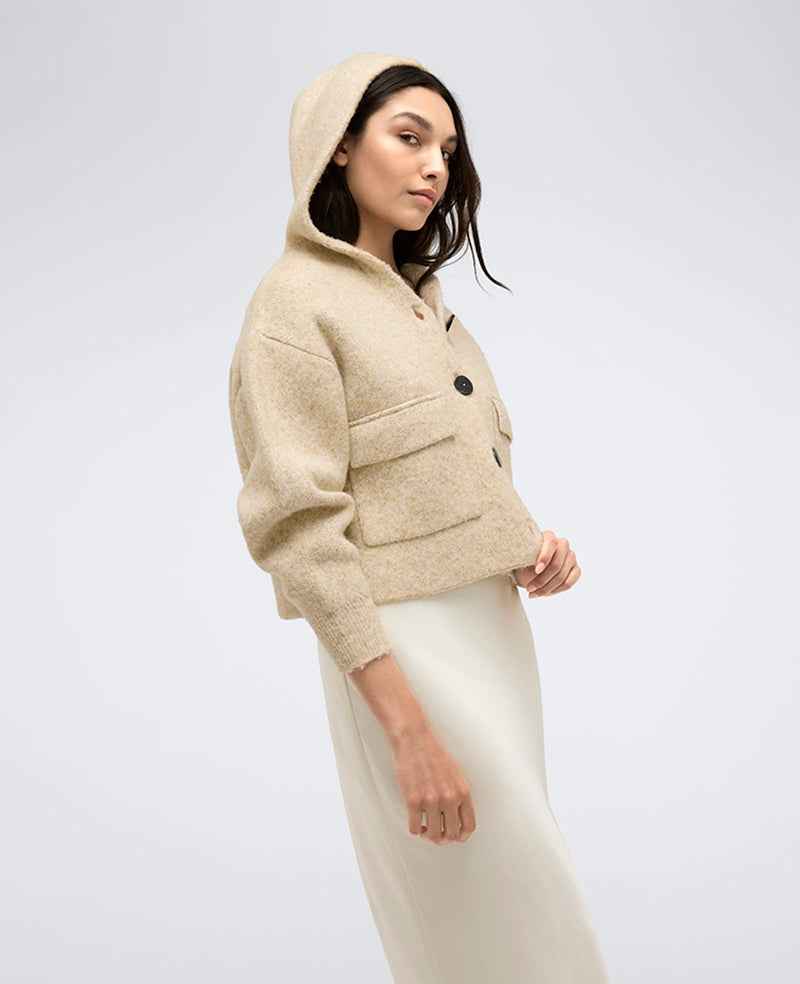 Kenneth Cole | Oversized Cropped Button Front Hooded Sweater in HEATHERED DRIFTWOOD, Size: XS