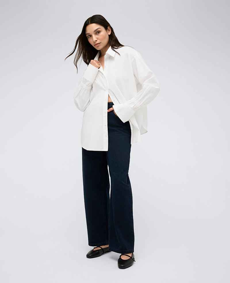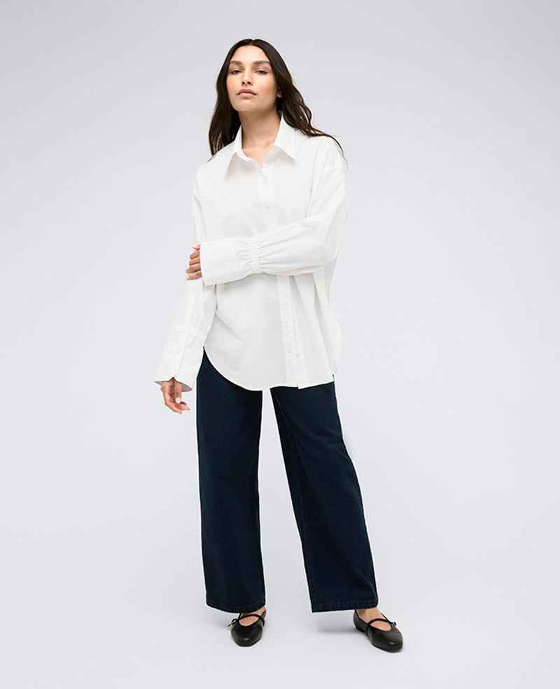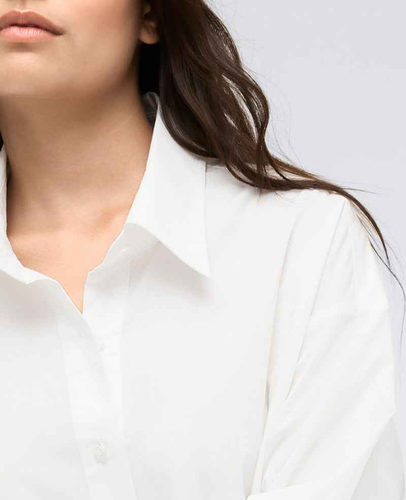 WHATS IN IT FOR YOU? Button front shirt Oversized for a comfortable fit Spread collar Long sleeves Elastic band around cuff with slits for a flared look Button-down placket 70% cotton, 27% nylon, 3% elastane Machine wash Imported Model Specs: Height 5'9", Bust 32.5", Waist 24", Hips 34.5" | Kenneth ...more