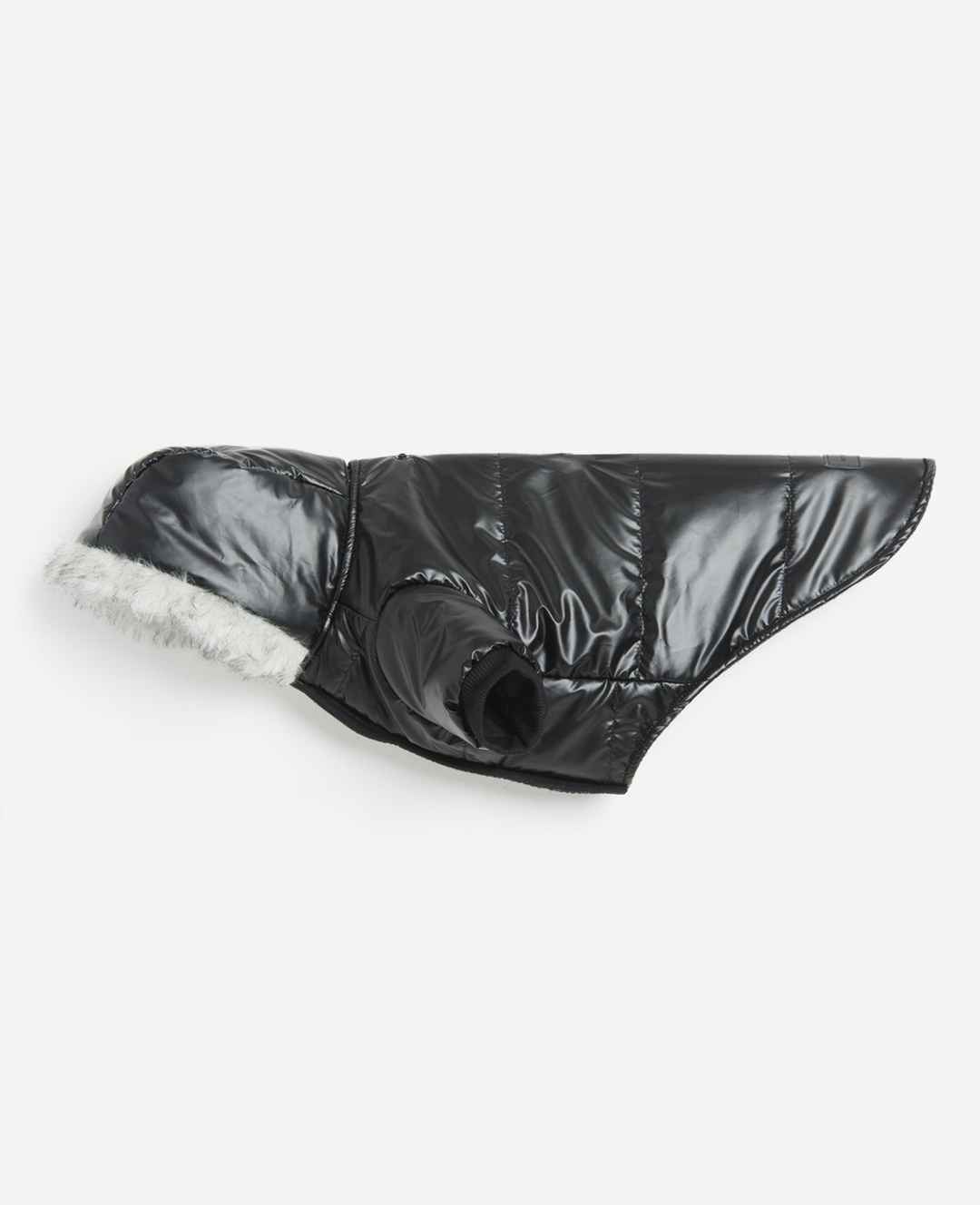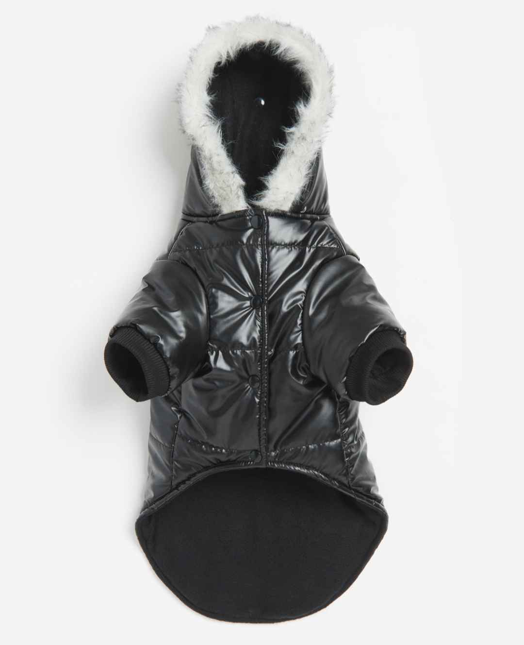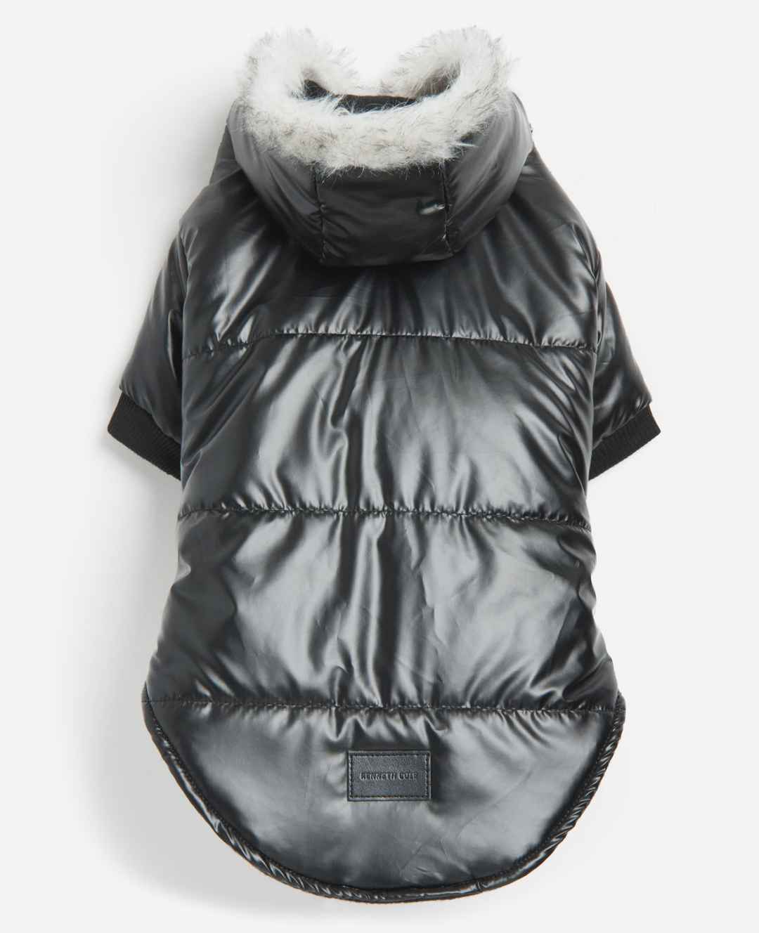 WHATS IN IT FOR YOU? Dog puffer coat Available in XS-L Easy on-and-off Keeps pets warm and stylish 100% polyester Machine washable Imported | Kenneth Cole | Metallic Hooded Puffer Dog Coat in Black, Size: XS