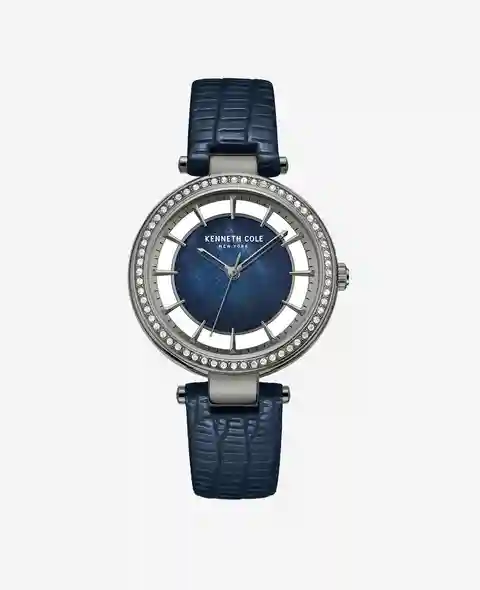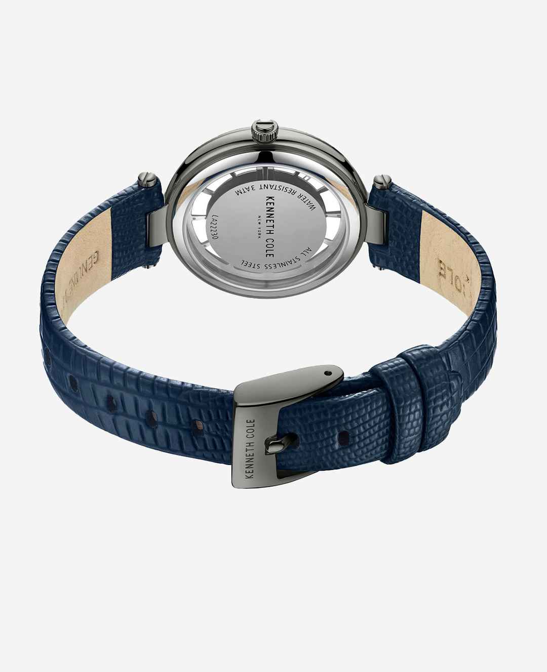 WHATS IN IT FOR YOU? Women's watch Silver round case with accented blue and white dial Hour/minute/second hands in silver finish Kenneth Cole logo detail Adjustable blue leather bracelet strap 3ATM water resistance Imported | Kenneth Cole | Modern Classic Slim Water Resistant Leather Strap Watch in ...more