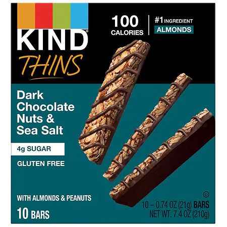 KIND THINS Dark Chocolate Nuts & Sea Salt bars are a thinner take on your favorite KIND bar. With almonds as the #1 ingredient, these gluten free bars feature a thin layer of sliced almonds and diced peanuts with a chocolatey coating and drizzle. These snack bars contain 4 grams of sugar and 90 calo...more