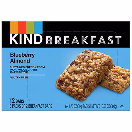 KIND Breakfast Blueberry Almond bars are a wholesome, healthy snack made with 100% whole grains for sustained energy. KIND Blueberry Almond breakfast bars are made with five super grains - oats, buckwheat, millet, amaranth and quinoa and baked with almonds and blueberries for a chewy, soft baked add...more