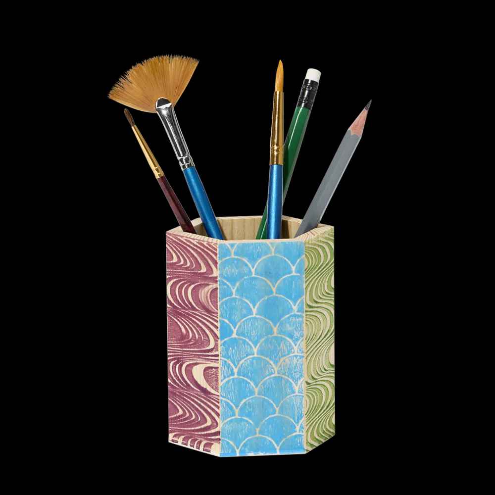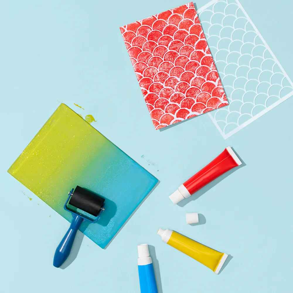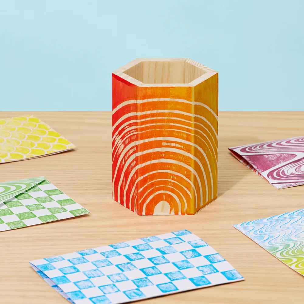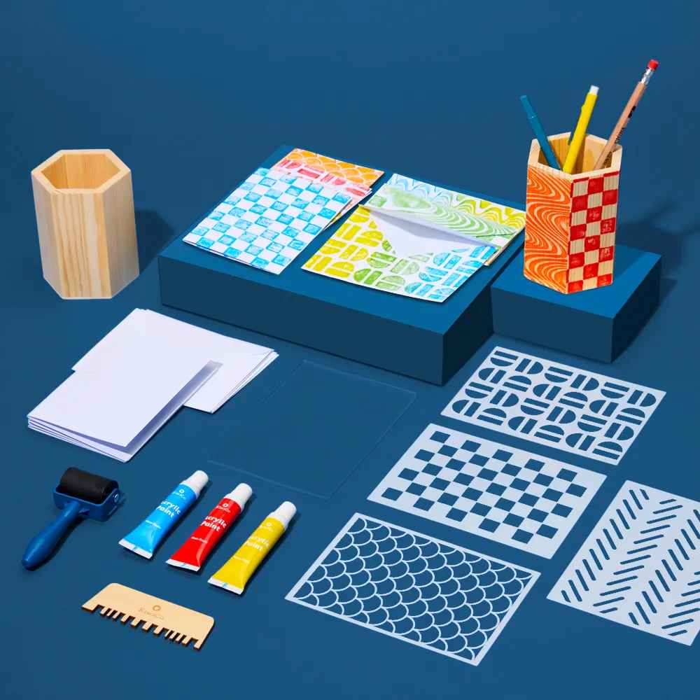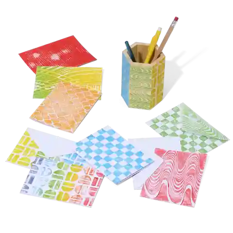 Create amazing graphic stationery and even customize a wooden pencil holder with your own designs. Mix colors and patterns to create one-of-a-kind monotype prints that are just your type!