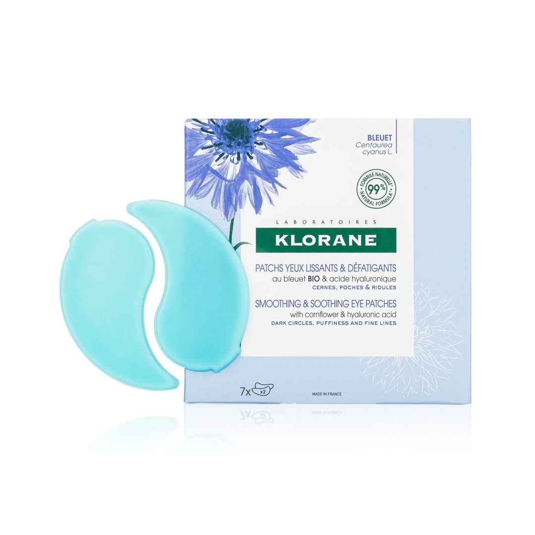 In just 15 minutes, soothing hydrogel eye patches visibly reduce signs of fatigue and under-eye puffiness, diminish the appearance of dark circles and visibly smooth fine lines. | Klorane Smoothing And Soothing Eye Patches With Cornflower | 7 Sets