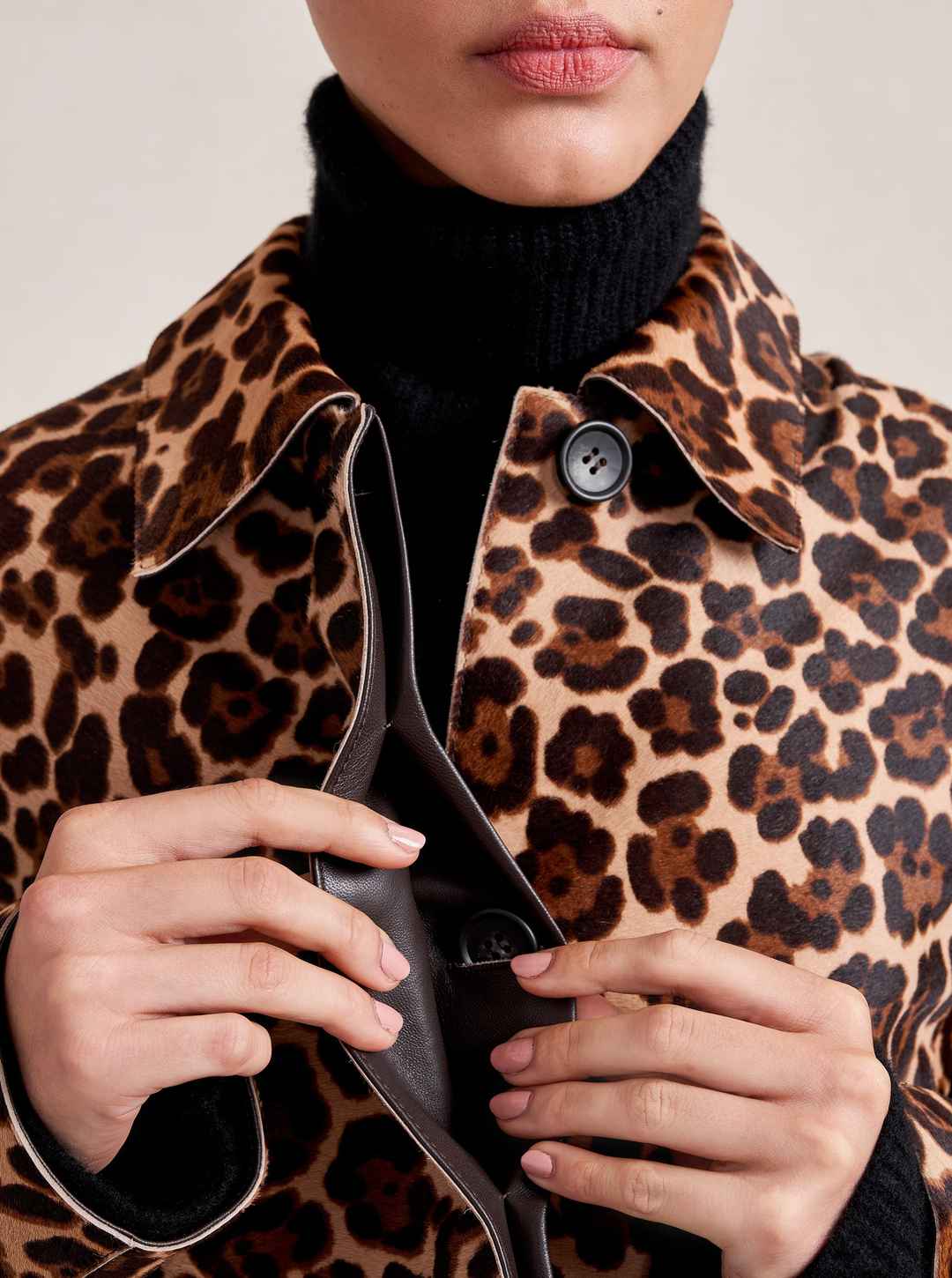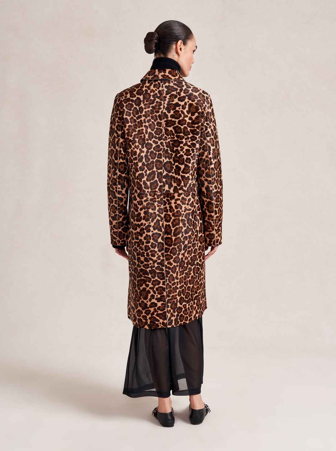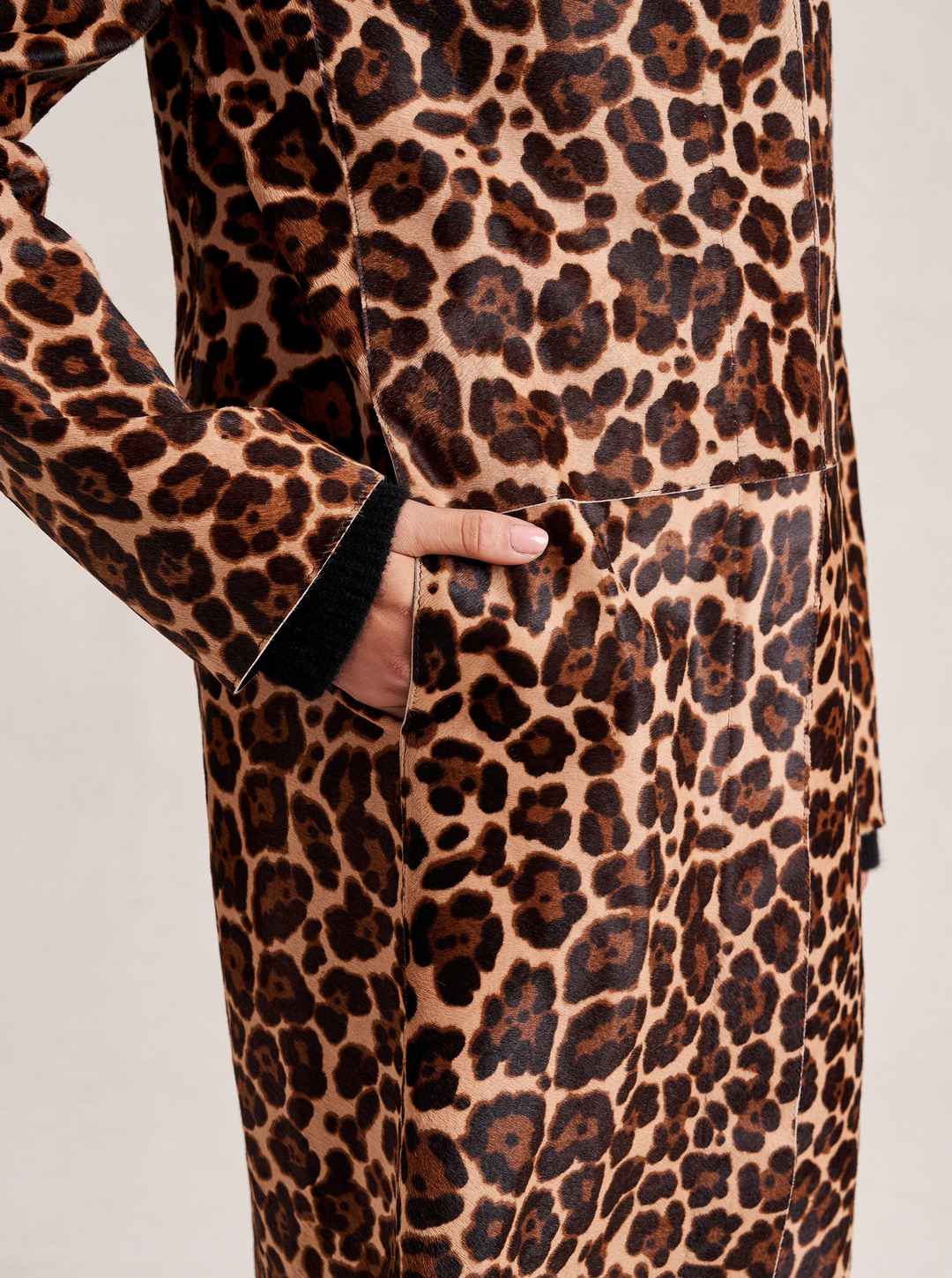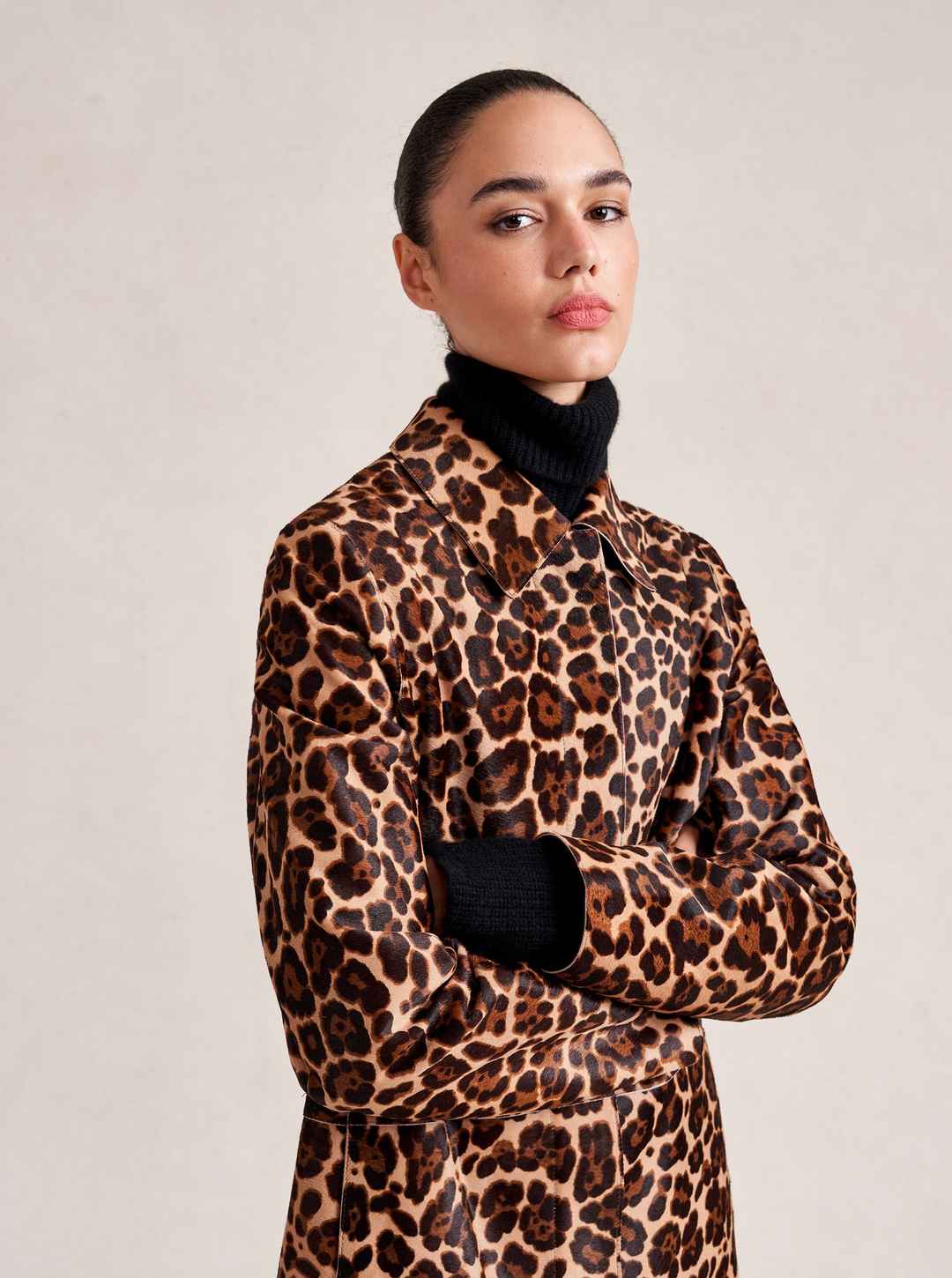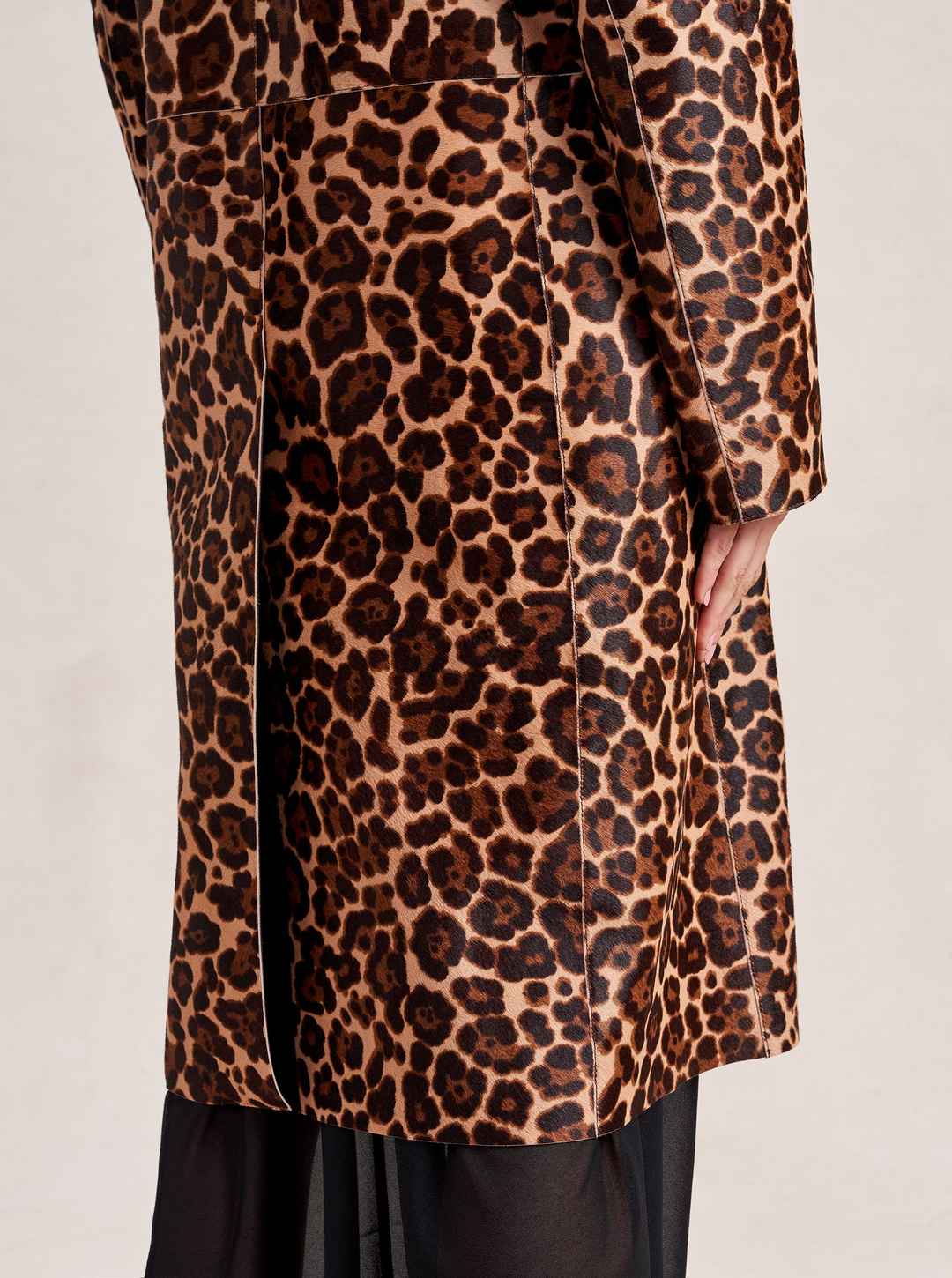 Our Caro Coat is a limited edition, mid-length leopard print coat made from 100% calf hair suede finished with a Napa leather under collar and placket. This timeless, single-breasted silhouette with set in sleeves is an investment piece that will only get better with age.