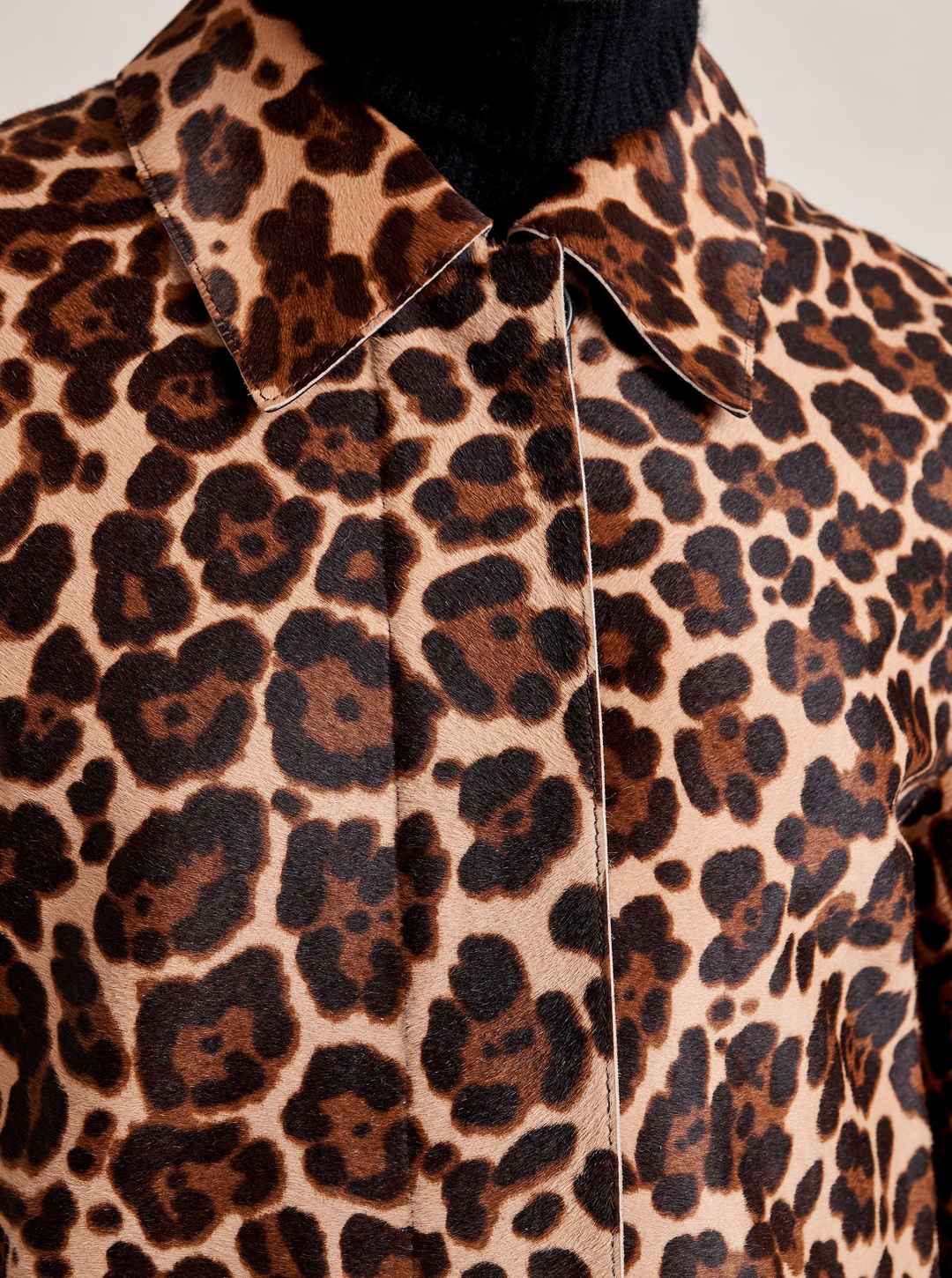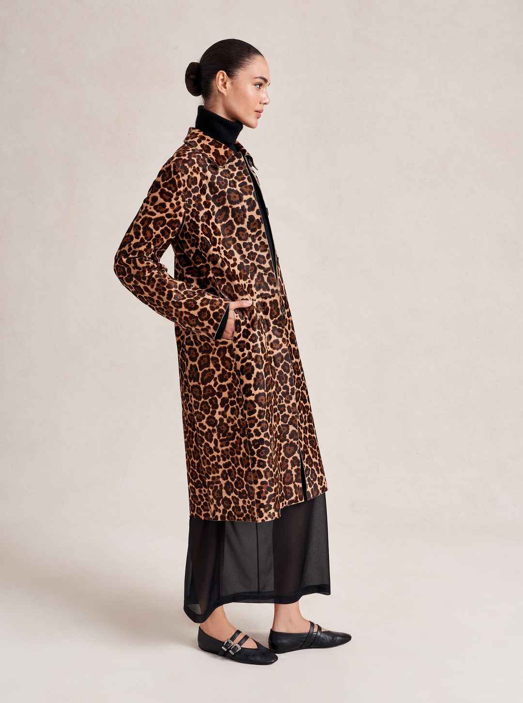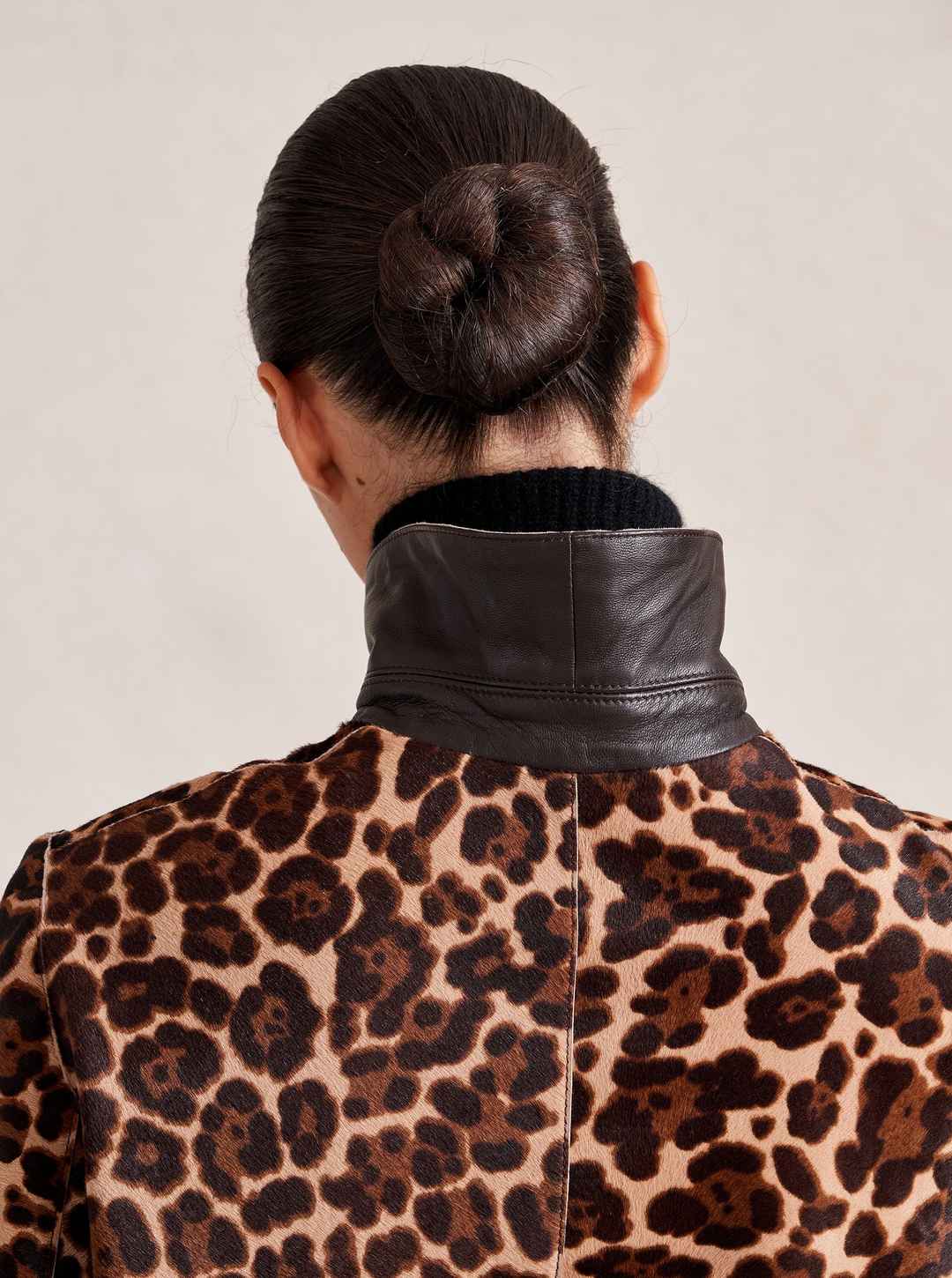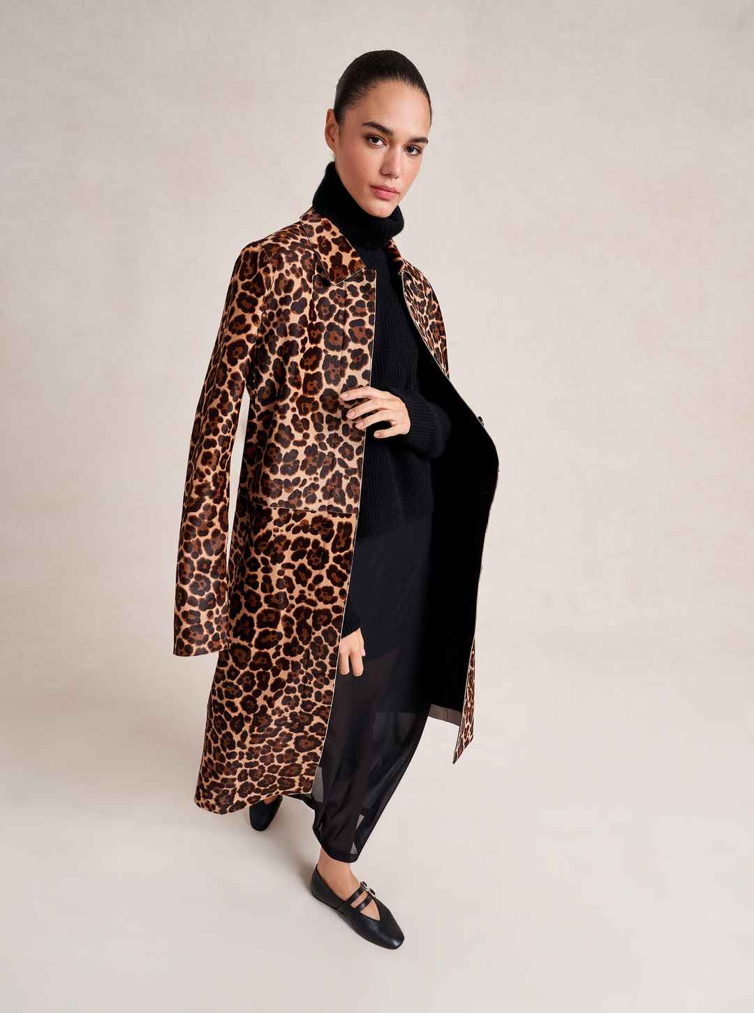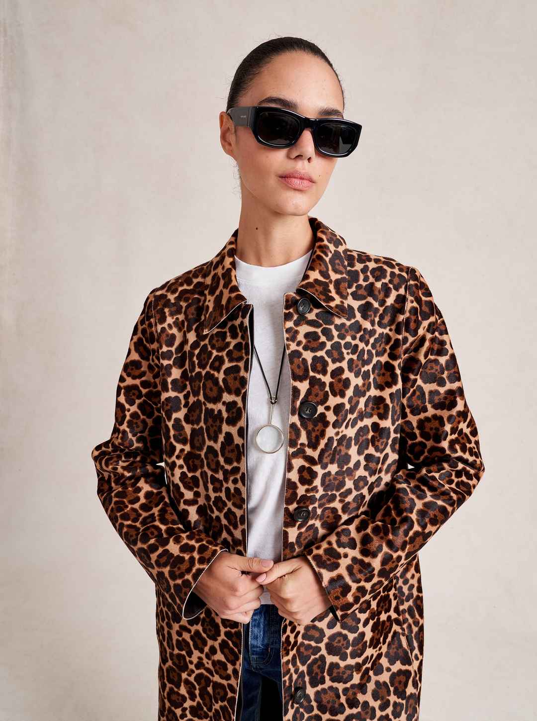 Our Caro Coat is a limited edition, mid-length leopard print coat made from 100% calf hair suede finished with a Napa leather under collar and placket. This timeless, single-breasted silhouette with set in sleeves is an investment piece that will only get better with age.