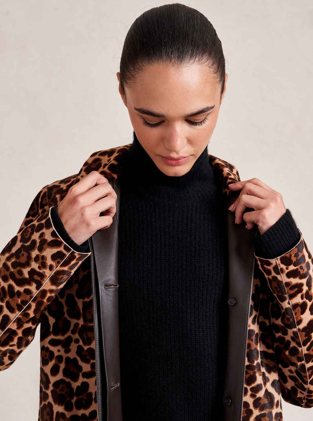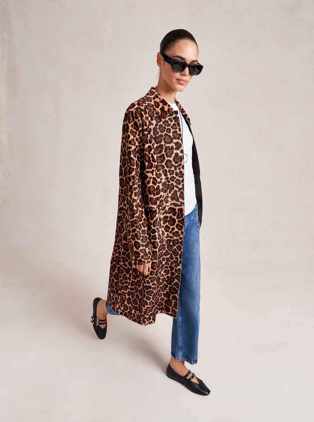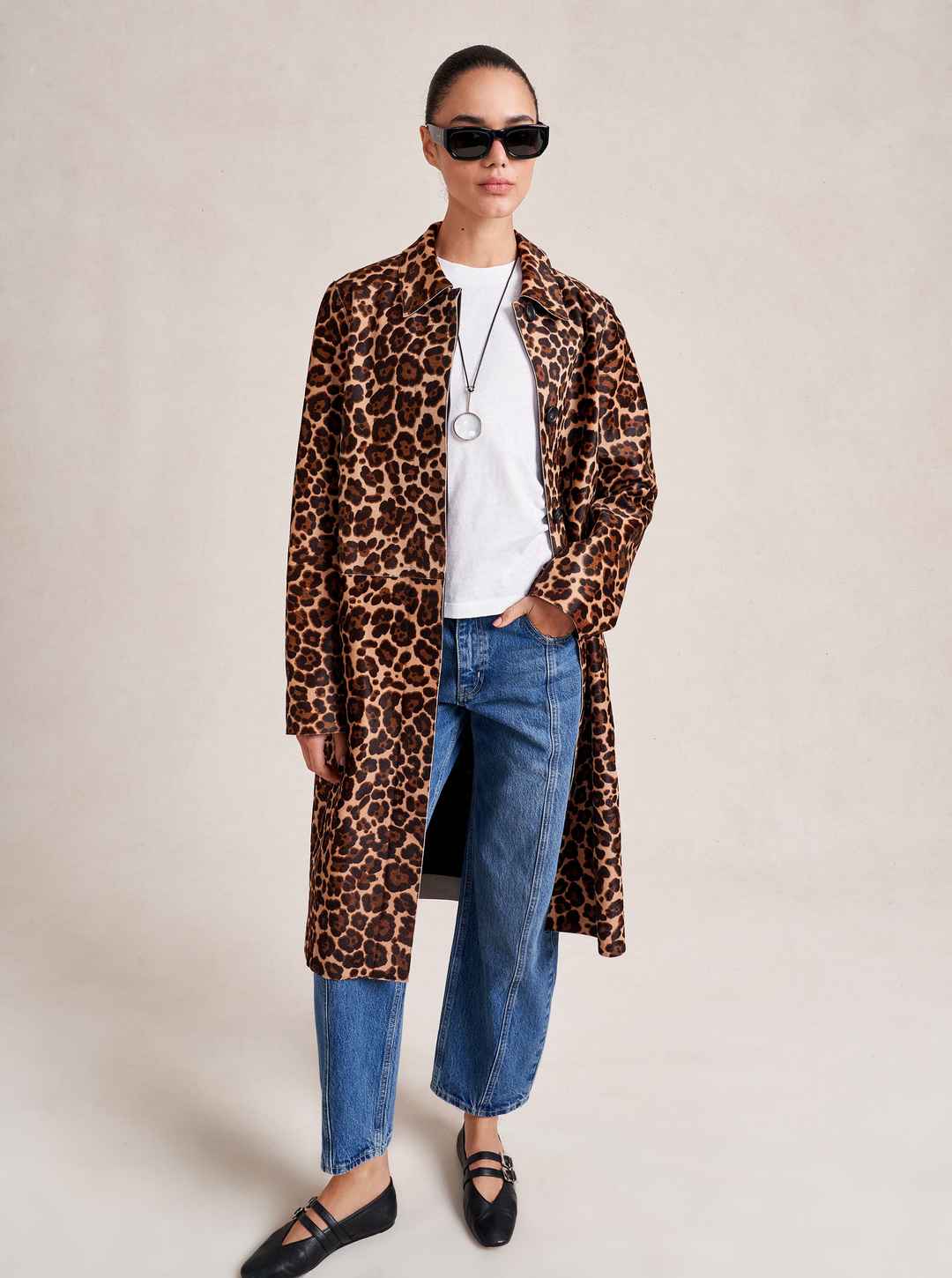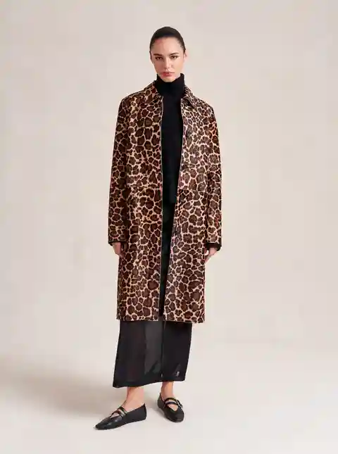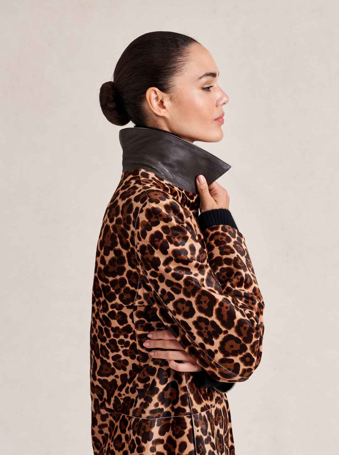 Our Caro Coat is a limited edition, mid-length leopard print coat made from 100% calf hair suede finished with a Napa leather under collar and placket. This timeless, single-breasted silhouette with set in sleeves is an investment piece that will only get better with age.