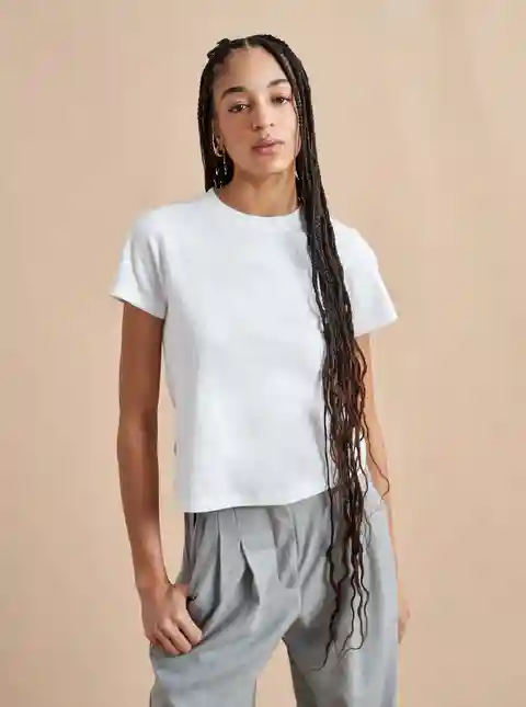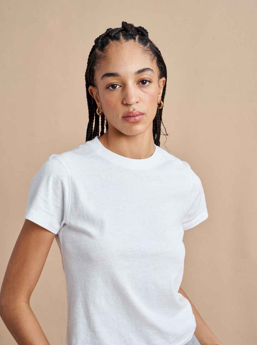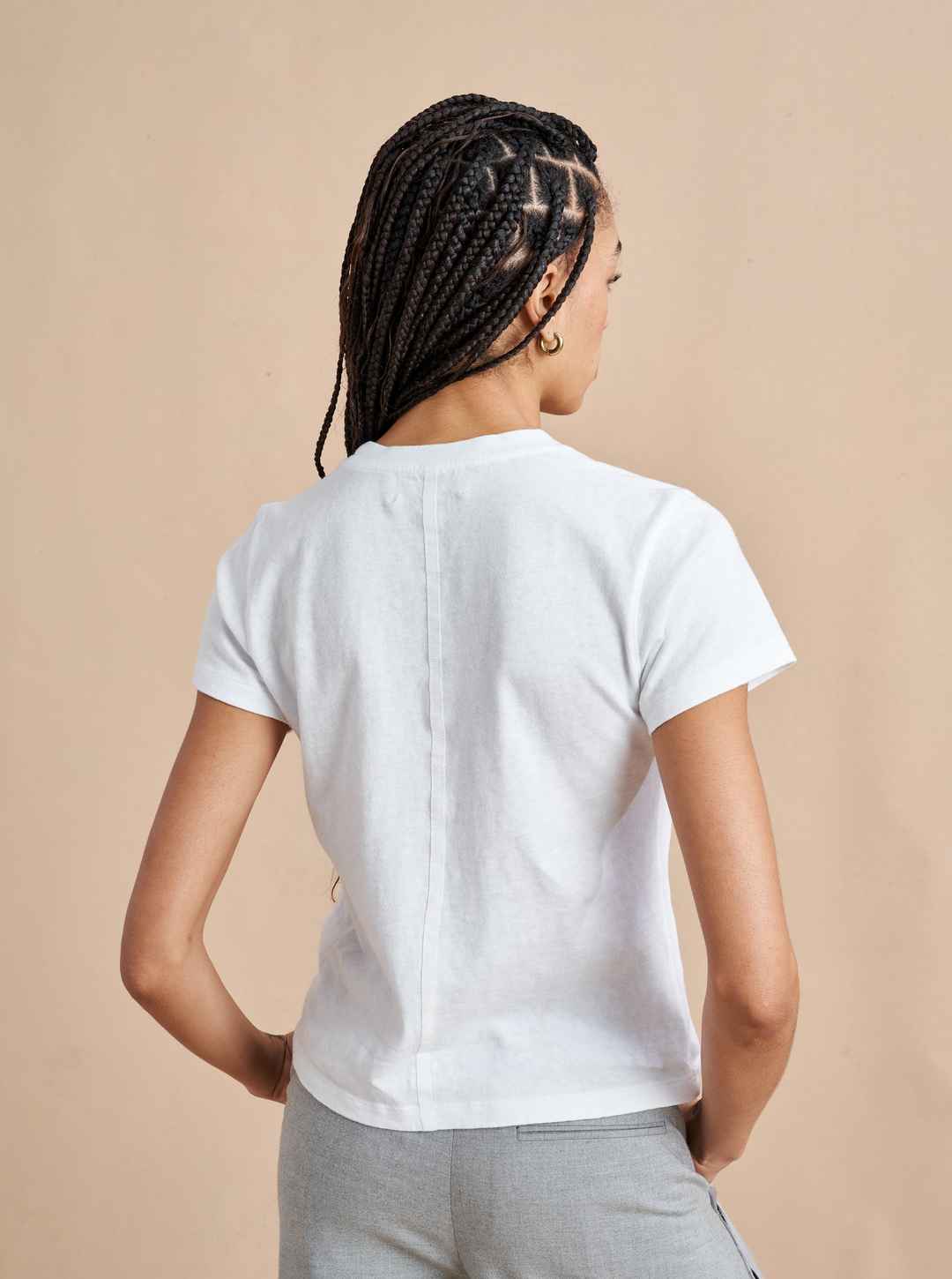 What makes the perfect tee? Why don't you ask our co-founders? Molly's vintage-inspired white t-shirt in super soft cotton with a crew neck, is more of slimmer fit, perfect for tucking into her namesake jean (or any of our jeans:-))