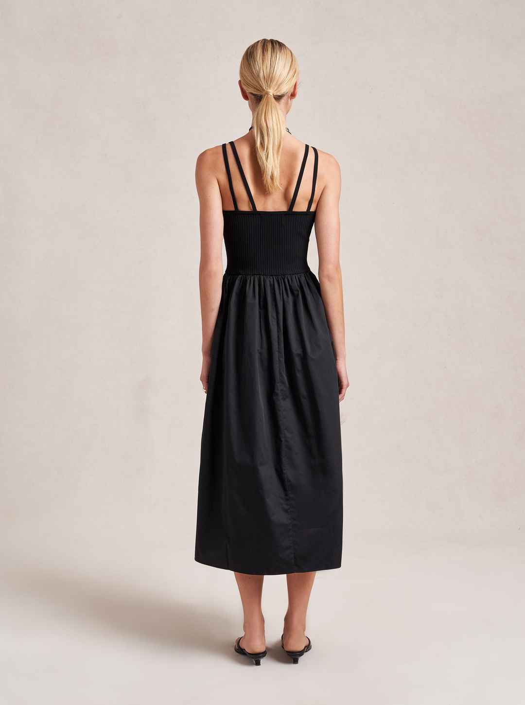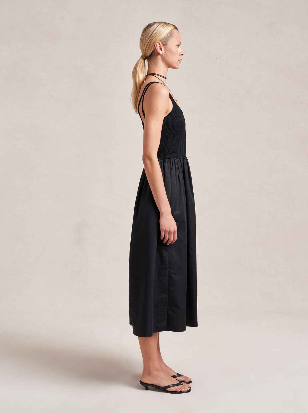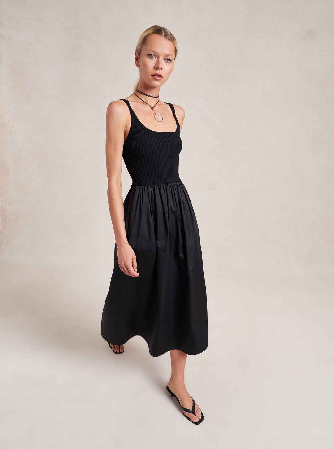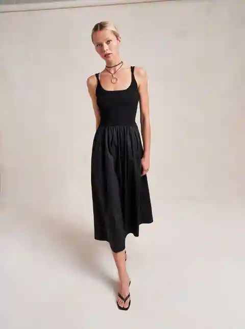 Like a great friend, this dress supports you in all the places you need it while leaving you room to breathe and be yourself. Meet Carmella with a 100% easy, breezy cotton poplin skirt with pockets seamed into a fitted, viscose blend, ribbed bodice.Friends for life.