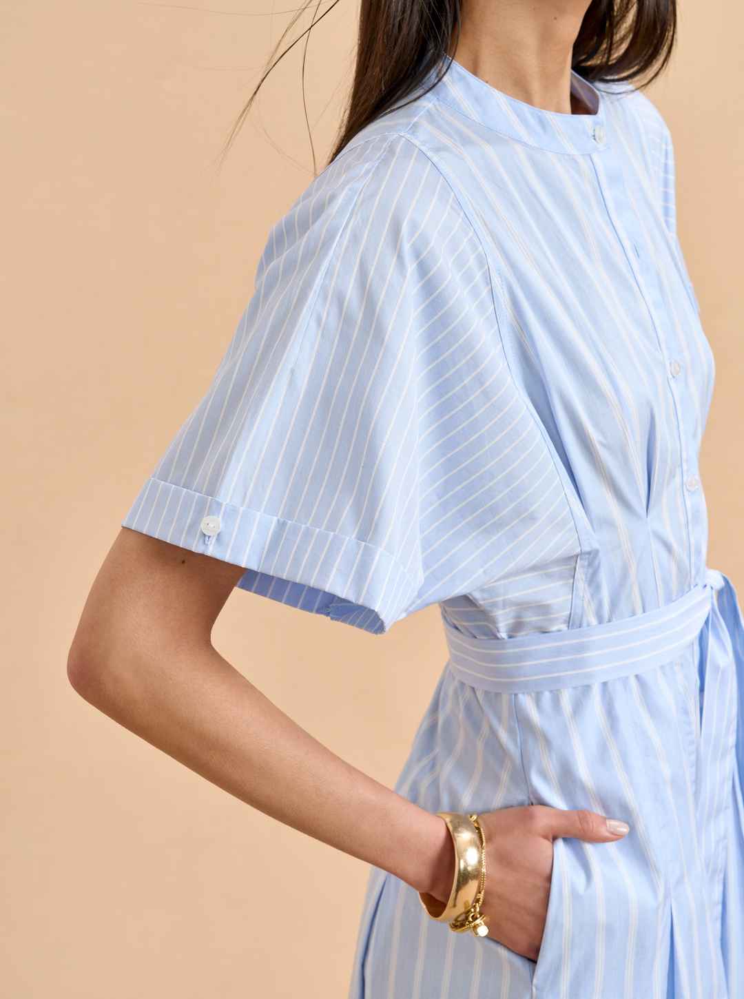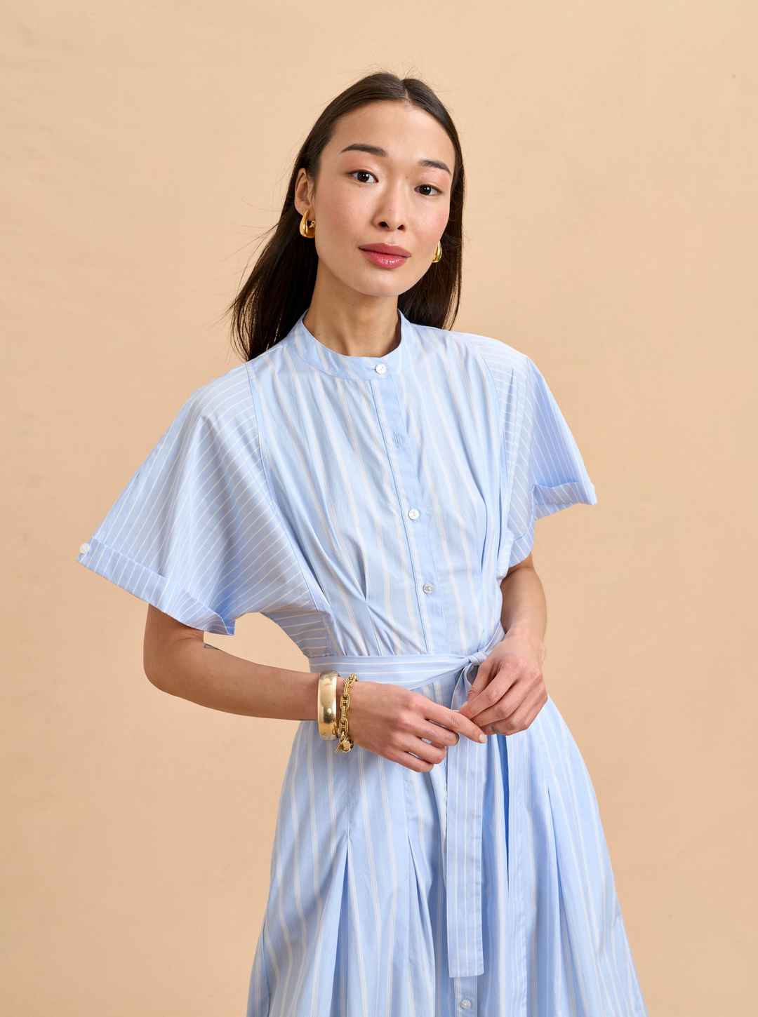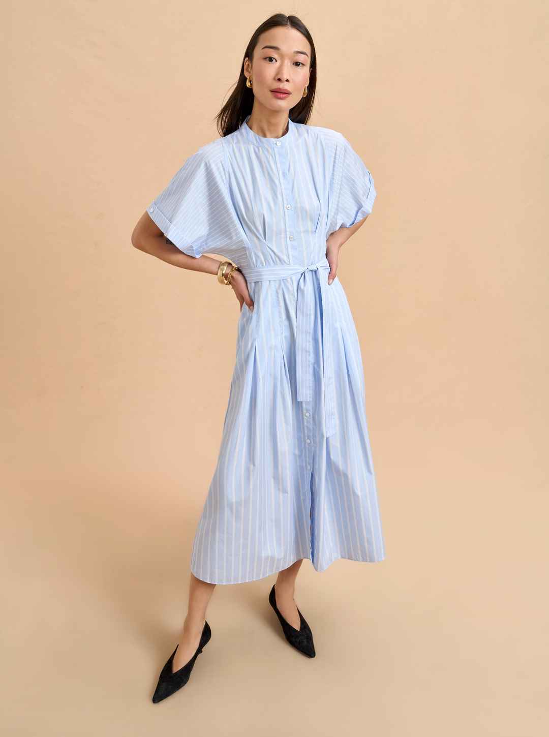 Who would have thought traditional blue and white poplin shirting could feel so feminine? Our Anna Dress, made from contrasting stripe prints in a classic, shirtdress style, with turnback short sleeves, a removable belt and pleats on the bodice for the ultimate spring/summer anytime option.