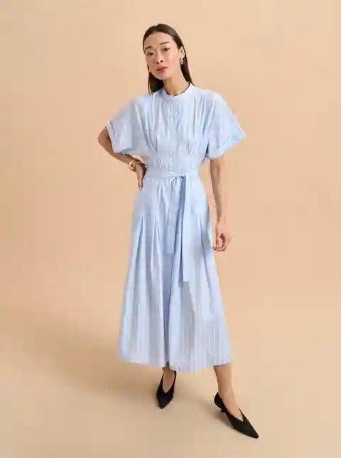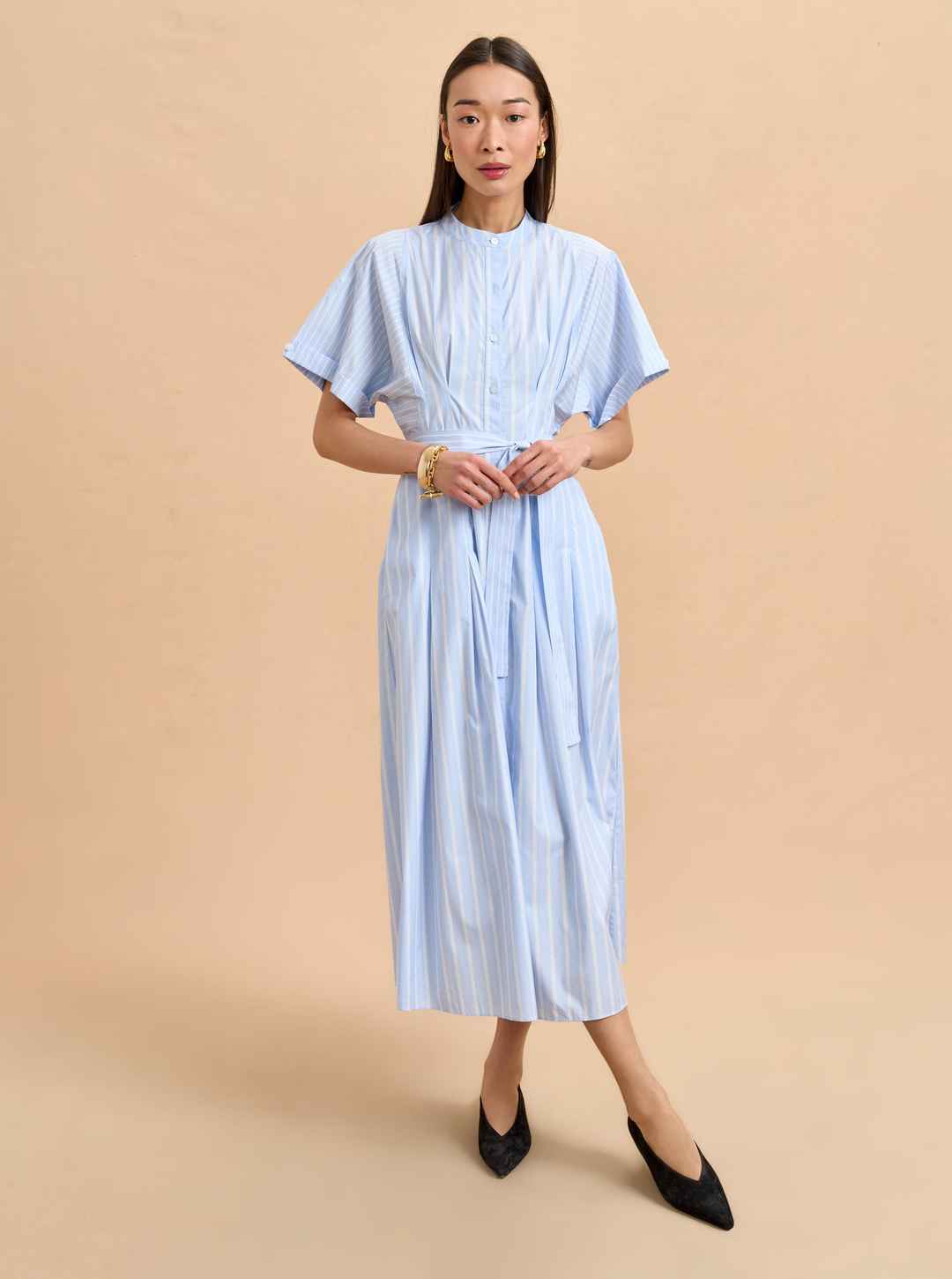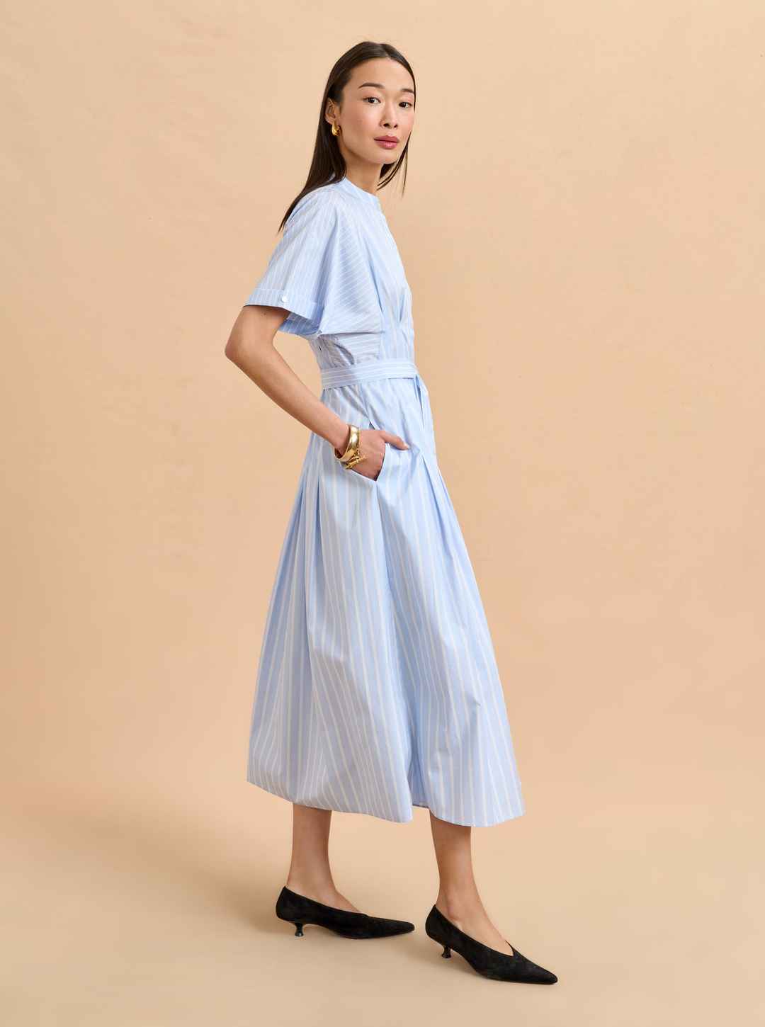 Who would have thought traditional blue and white poplin shirting could feel so feminine? Our Anna Dress, made from contrasting stripe prints in a classic, shirtdress style, with turnback short sleeves, a removable belt and pleats on the bodice for the ultimate spring/summer anytime option.